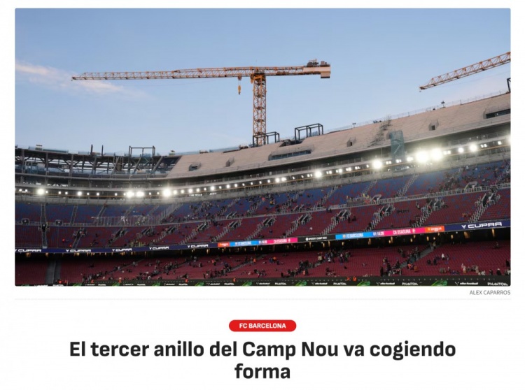《阿斯报》表示,诺坎普球场的第三层看台正在建设中,侧门和南门区域的工程进展顺利,预制混凝土板正在安装中。新的看台将比之前的看台更高更陡,预计将于2026-27赛季完工,顶棚将于2027年底至2028年初之间完成,该球场翻新后预计可容纳约10.5万名观众。