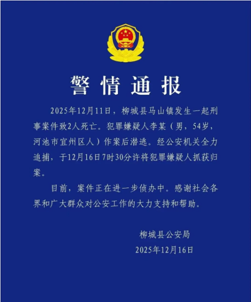 16日柳城警方发布警情通告:2025年12月11日,柳城县马山镇发生一起刑事案件,造成2人死亡。犯罪嫌疑人李某(男,54岁,河池市宜州区人)已于12月16日7时30分许被公安机关抓获归案。