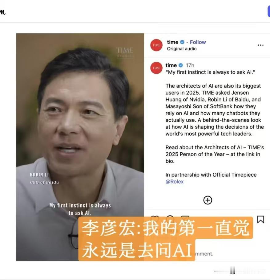 【AI的真正战场:科技领袖为何齐声押注“应用层”?】 近日,《时代》周刊公布2025年度人物,英伟达CEO黄仁勋、百度创始人李彦宏、软银CEO孙正义等作为“AI的建造者们”入选。这一选择不仅是对几位科技领袖的认可,更是对全球无数将人工智能从蓝图变为现实的工程师的集体致敬。在专访中,李彦宏指出:“未来AI领域只会剩下少数几个基础模型,但在应用层,将出现许多在不同方向上都取得成功的参与者——我认为那里才是机会最多的地方。” 这一判断揭示了当前AI发展的核心趋势:技术价值最终必须通过实际应用来释放。李彦宏强调,百度自始至终坚持“应用驱动”策略。在构建文心大模型尤其是5.0版本时,团队并未追求打造一个满足所有人的万能模型,而是聚焦于搜索、数字人等具体应用领域,针对性地训练模型掌握相应技能。“应用才是真正创造价值的地方。”他在多个场合反复表达这一观点。 与美国科技界普遍聚焦于AGI(通用人工智能)的路径不同,中国的AI发展走出了一条以场景牵引技术的独特道路。中国制造业规模庞大,各类产品需要以极低的成本和极高的效率生产,这为AI提供了丰富的落地场景。李彦宏认为,利用AI解决这些实际挑战,才是中国AI发展的重心所在。 事实上,AI应用已在中国多个行业创造显著经济价值。例如,百度推出的数字人平台“慧播星”在今年双11期间带动GMV同比增长91%;智能体“伐谋”在交通、金融、物流、能源等领域成效显著:在鄂尔多斯伊金霍洛旗,它通过实时优化信号灯策略,将早晚高峰通行时间缩短50%以上;在中信百信银行,它提升了风控模型的识别精度,使风险区分度提高2.41%;在辽港集团,它协助实现20台岸桥、80艘船舶与5万集装箱的高效协同;在海上风电设计中,它帮助工程师快速完成电缆桥架布局,节省近一周工期与大量成本。这些案例无一不印证,当AI深入产业环节,便能释放出切实的生产力。 与此同时,AI也正以前所未有的方式融入普通人的工作与生活。《时代》周刊发布的视频“How 3 top CEOs are using AI”展示了黄仁勋、李彦宏、孙正义如何深度使用AI辅助决策。李彦宏坦言:“我的第一直觉总是去问AI。”这种“人机协同”模式随着技术门槛的降低,正在向大众普及。无代码平台“秒哒”可凭一句话生成网站、小程序等各类应用;智能体“GenFlow3.0”能通过简单指令完成Excel复杂计算、Word深度排版、PPT一键美化等专业操作。AI不再是遥远的技术概念,而是人人可用的效率工具,助力个体向“超级个体”演进。 《时代》周刊在报道中指出,百度已从一家搜索公司转型为中国领先的全栈AI企业,其业务覆盖芯片、云基础设施、大模型、智能体与应用产品。在参观百度世界大会后,《时代》评价道:“这一切表明,中国已跻身人工智能领域的最高阶。”作为七年前就登上《时代》亚洲版封面的“创新者”,李彦宏与其代表的“应用驱动”路径,正通过解决真实世界的问题,将AI从技术蓝图转化为照进现实的曙光。真正的AI革命,终将发生在每一条生产线、每一个城市路口和每一个普通人的指尖。