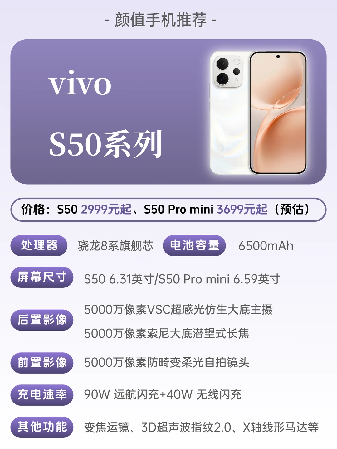 临近年底,本以为今年不会有新机型发布了,但是没想到vivo将在12月15日发布自家的颜值拍照手机📱,那问题来了你们会觉得卖多少钱?💰 💡💡我个人觉得会卖2999元起步❗️ 👉今年vivo S50系列影像方面vivo用料非常扎实,采用了堪比旗舰机影像的VSC超感光仿生大底主摄和索尼IMX882大底潜望式长焦,在旗舰同款的全焦段变焦闪光灯加持下可以获得更加稳定的夜景人像拍摄效果。 📷前置的5000万像素柔光镜头自拍光感更柔和,支持防畸变功能,还有高光慢动作、变焦运镜等丰富的拍照功能,可以拍摄很多趣味视频。 👉性能方面vivo S50系列搭载了骁龙8系旗舰芯,搭配上LPDDR5X Ultra+UFS 4.1性能铁三角,跑分超300万分,游戏表现完全不输性能机,畅玩各种大型游戏。 🥰全新的告白配色采用纱缎光刻工艺背板+金属中框质感拉满,还有6500mAh蓝海电池以及90W远航闪充和40W无线闪充,彻底杜绝续航焦虑,IP68+IP69防尘防水安全性能MAX。尺寸方面vivo S50标准版为6.31英寸,而S50 Pro mini则是6.59英寸,比一般的Pro版机型更加小巧精致。 💰价格方面vivo S50预计2999元起步,S50 Pro mini预计3699元起。 👉看了下最近热门的拍照中端机 🌟OPPO Reno15售价2999元起,Reno15 Pro售价3699元起 🌟nova15预计跟上一代持平首发2699元起,nova15 Pro预计3499元起。 👉总的来说,三款机型在影像方面都下足了功夫并且各有千秋,但是在其他配置上,vivo S50系列显得更加用心,不但搭载了骁龙8系列旗舰芯片拥有出色的游戏性能,还有3D超声波指纹2.0、IP68+IP69防水等配置,外围配置也向旗舰机看齐,在三款机型价格相似的情况下,2999元起步的vivo S50系列性价比更高更值得入手。 vivoS50系列OPPOReno15系列华为nova15系列手机推荐拍照手机好物分享vivoS50我的告白本命色vivoS50Promini