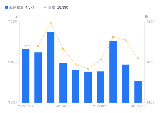 日期A股户数(户)流通A股户均持股数(股)户均持股市值(万元)2025-12-10456655166.609.502025-11-28529884452.579.002025-11-20635843710.577.612025-10-31499394724.428.602025-10-20497854739.038.232025-09-30506724656.088.282025-09-19537204391.908.492025-09-10675203494.277.652025-08-20584404037.187.922025-07-31600023932.087.73
