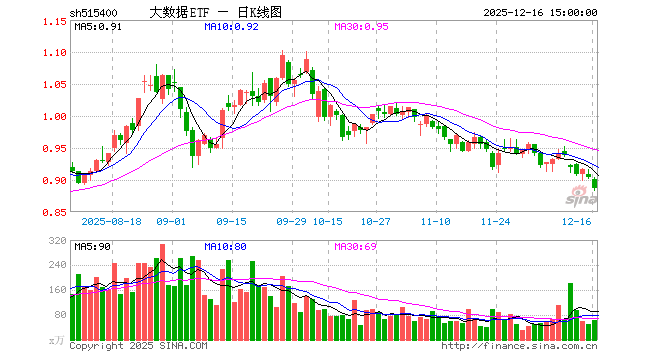 12月16日,大数据ETF(515400)跌1.88%,成交额5568.61万元。当日份额增加100.00万份,最新份额为12.38亿份,近20个交易日份额增加2700.00万份。最新资产净值计算值为10.96亿元。