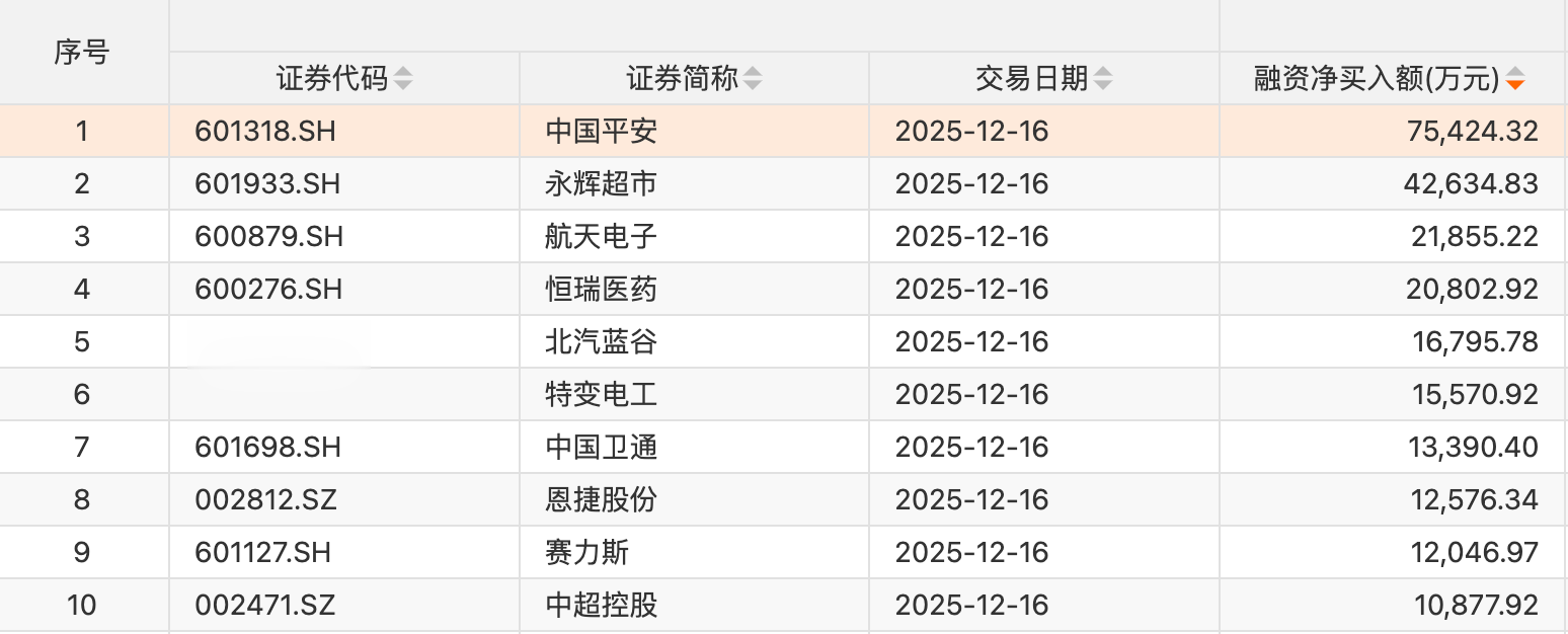 个股方面,10只个股获融资净买入额超1亿元。中国平安获融资净买入额居首,净买入7.54亿元;融资净买入金额居前的还有永辉超市、航天电子、恒瑞医药、北汽蓝谷、特变电工、中国卫通、恩捷股份、赛力斯、中超控股等。