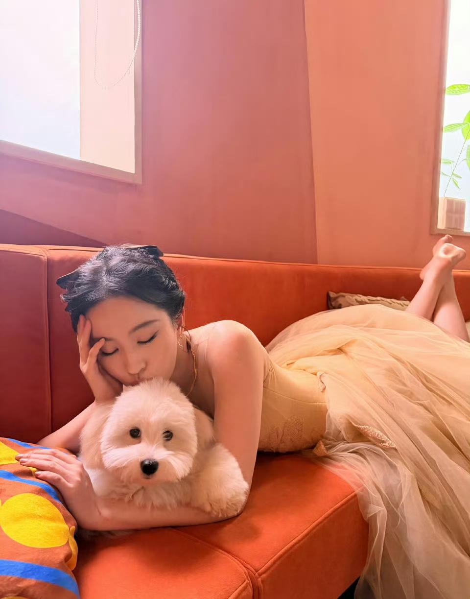 有谁和我一样狠狠的羡慕刘亦菲怀中的那只小狗,有多幸运才能被刘亦菲抱在怀中。 照片中刘亦菲穿着长裙俏皮的躺在沙发上,怀里还抱着一只白色可爱小狗,已经38岁的她,一点都看不出来她马上就是要奔四的人,看着更像是个刚出校园的大学生。 小狗狗很乖的被刘亦菲抱着,睁着大眼睛好奇的看着镜头,呆萌呆萌的,看着小狗这可爱的模样,刘亦菲忍不住亲了亲小狗的脑袋,这一刻好想魂穿刘亦菲怀中的那只小狗啊!