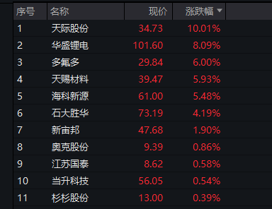 上证报中国证券网讯12月17日上午交易时段,锂电电解液概念震荡反弹。10时34分,天际股份涨停,华盛锂电、多氟多跟涨。