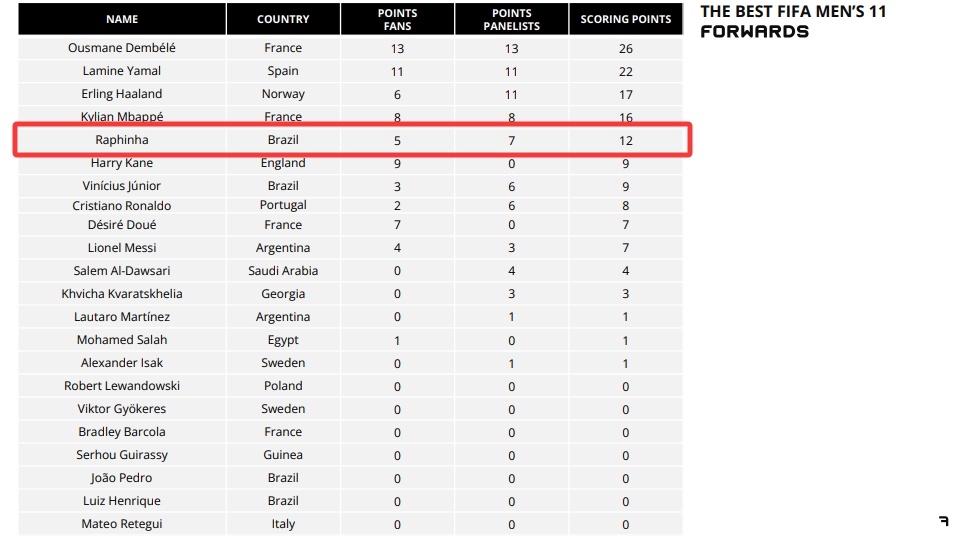 在国际足联公布的最佳阵前锋位置评分中,拉菲尼亚排名第五,其中球迷评分5分、专家评分7分,总得分12分,落后于登贝莱(26分)、亚马尔(22分)、哈兰德(17分)、姆巴佩(16分)。