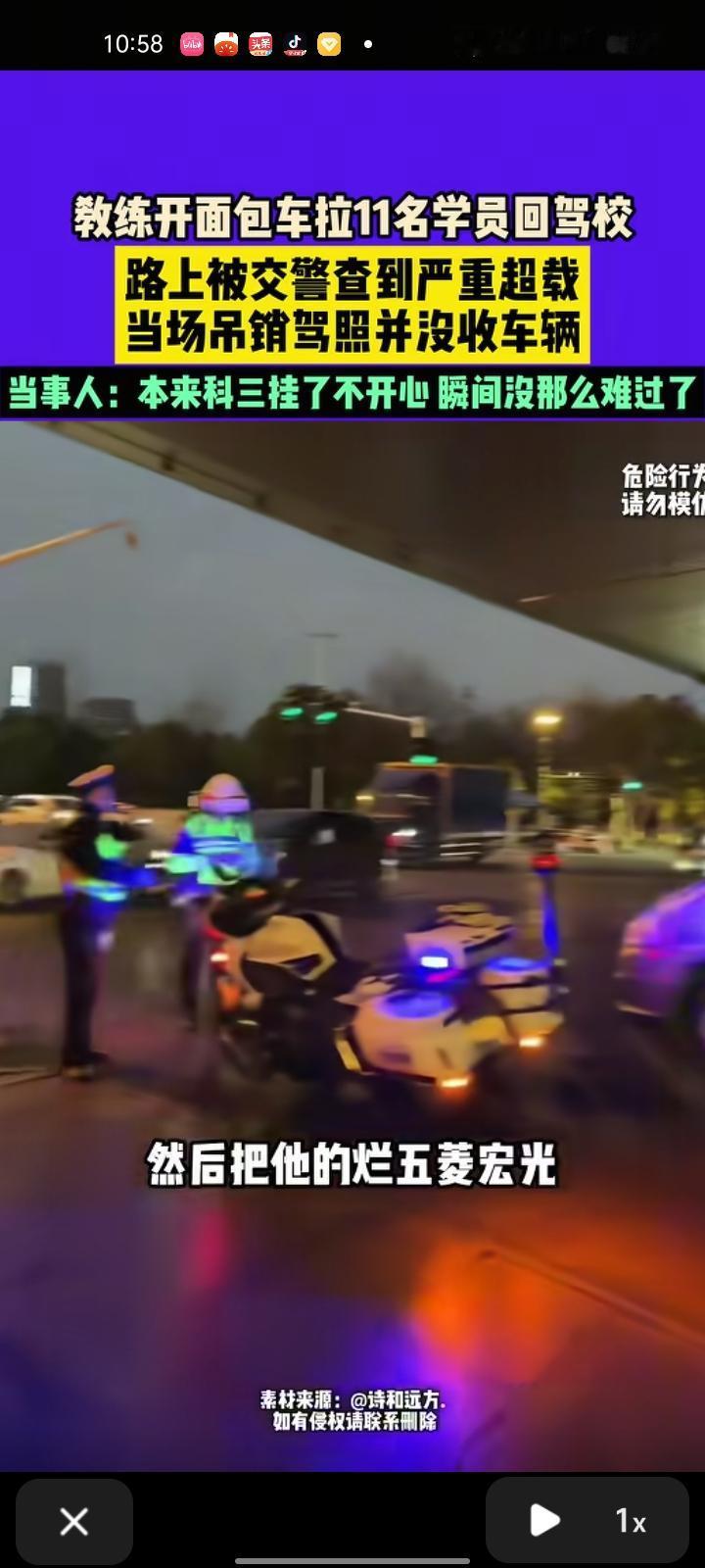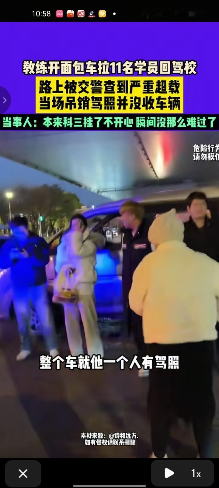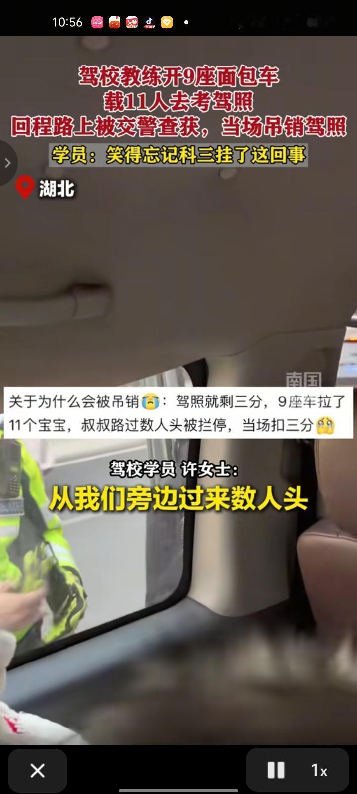 12月15日,湖北武汉。驾校教练开面包车载11人去考驾照,回程路上被交警查获,驾照被扣了九分。他们拍完合照后,交警让他们自行解散,然后把教练的车没收了。 当事人表示,本来科目三挂了都不开心,瞬间没那么难过了。