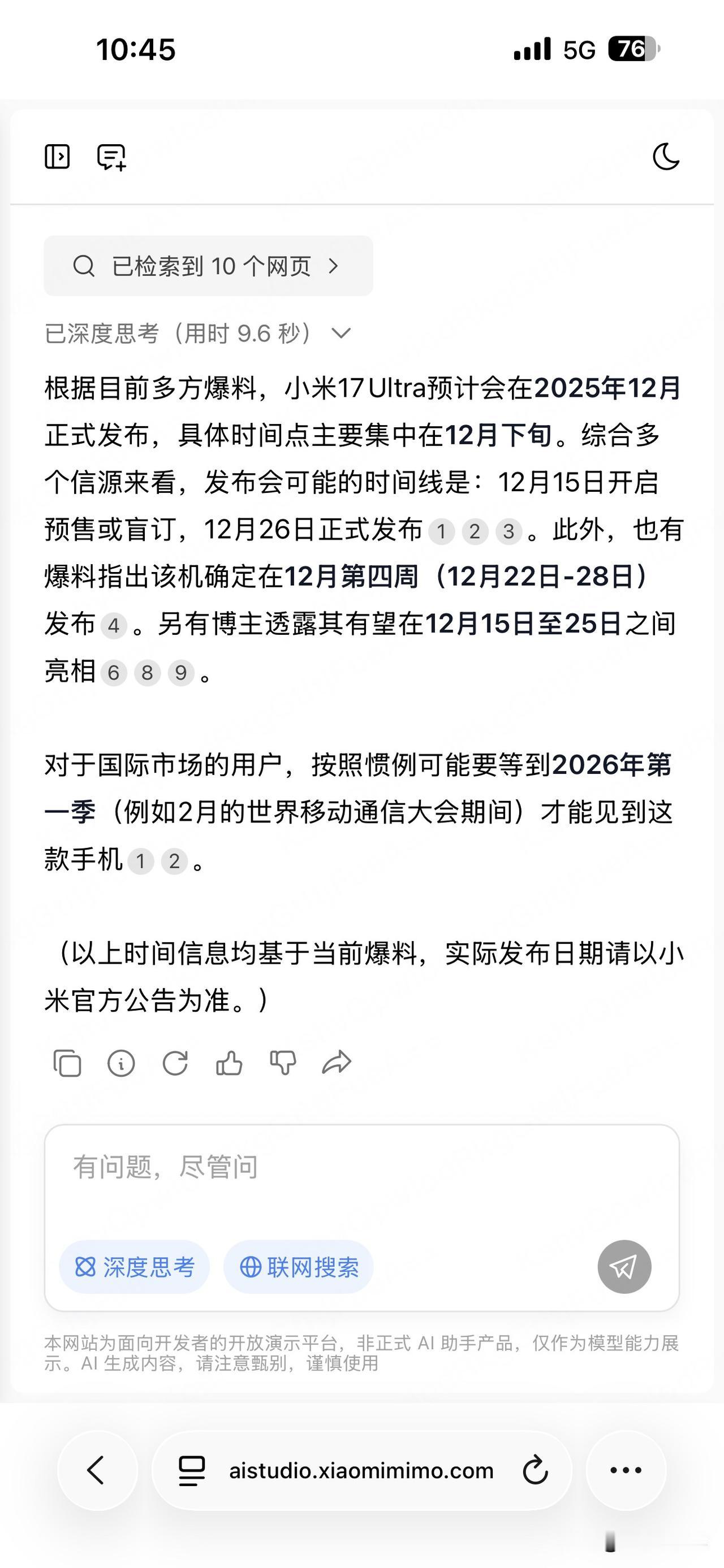 体验地址在这里: 目前还是网页形式,还没有独立的 App,可以蹲蹲看小米 17 Ultra 发布日期这个问题的答案准确度有多高。[吐舌]