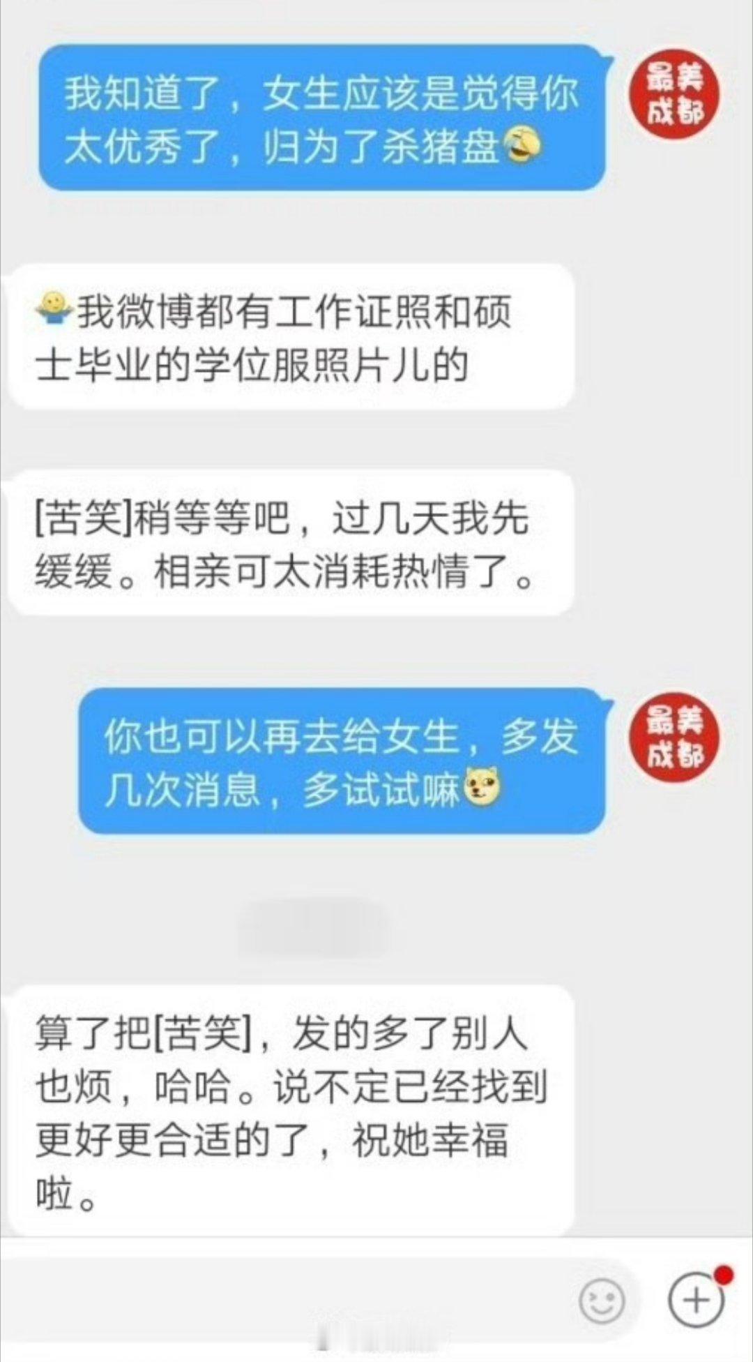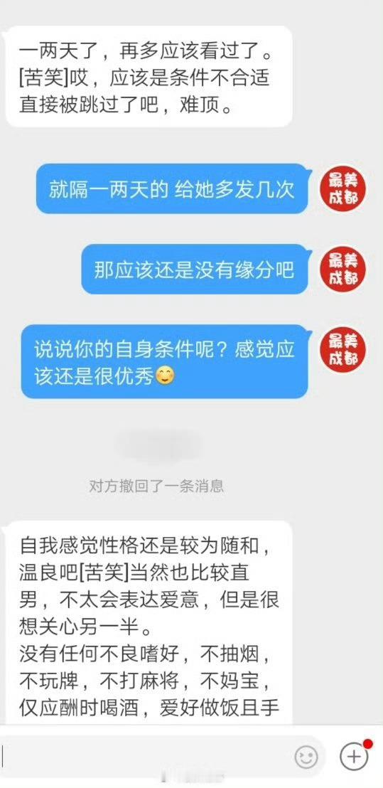 【给女生私信发消息都石沉大海,我条件不差 问题出在哪】小美,按说我条件也不算太差,但给女生发私信都石沉大海,一点回音都没有!难道还有啥格式或要求吗?哎,过几天再说吧,我累了先缓缓,相亲太消耗热情精力了… 被家暴13年女子回应为啥不离婚你私信过异性吗?对方回你没?马上又要过年了… 结了婚的人才懂被托举有多幸福 成都