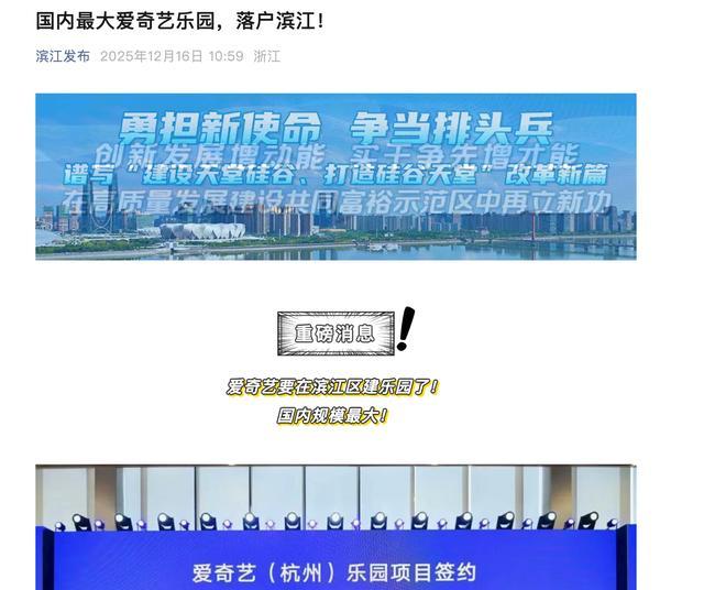 [环球网科技综合报道]12月17日消息,据“滨江发布”官方公布,杭州市文化广电旅游局、滨江区政府、北京爱奇艺科技有限公司三方签约,“爱奇艺乐园”项目正式落户位于“大莲花”旁的杭州市“文化两中心”,计划于2027年开放。
