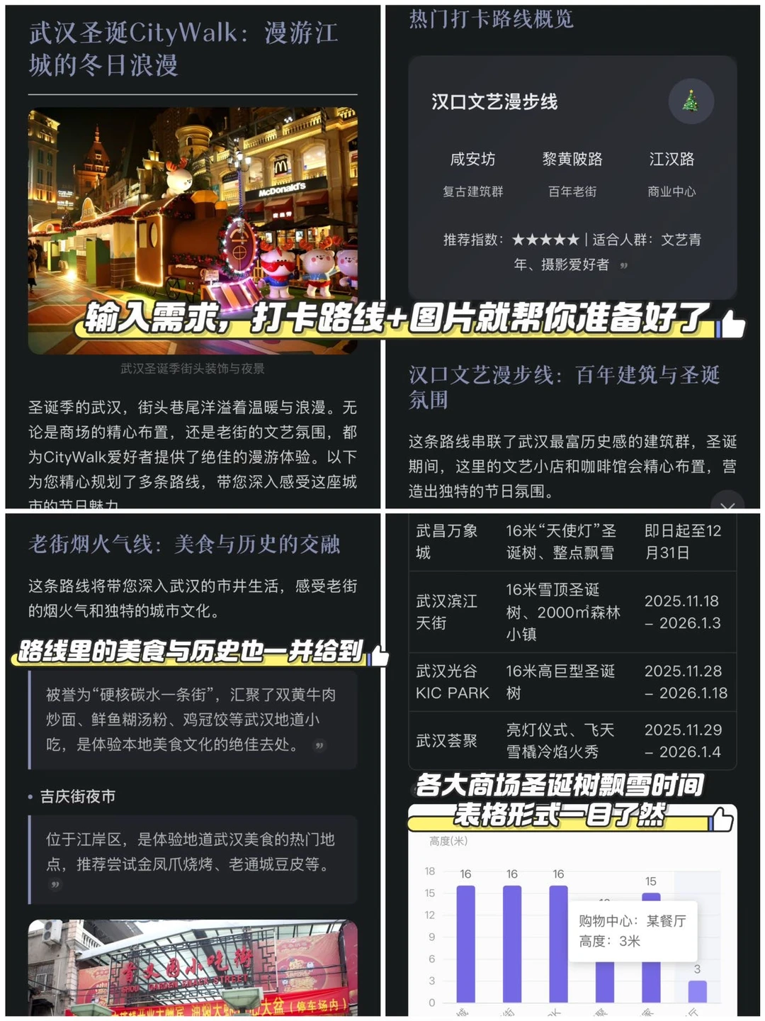 武汉的大街小巷真的很难走!老武汉人都不一定能走全,用灵光可以提前规划好适合的路线,包含吃住行和交通,圣诞氛围感小店都能找到!!