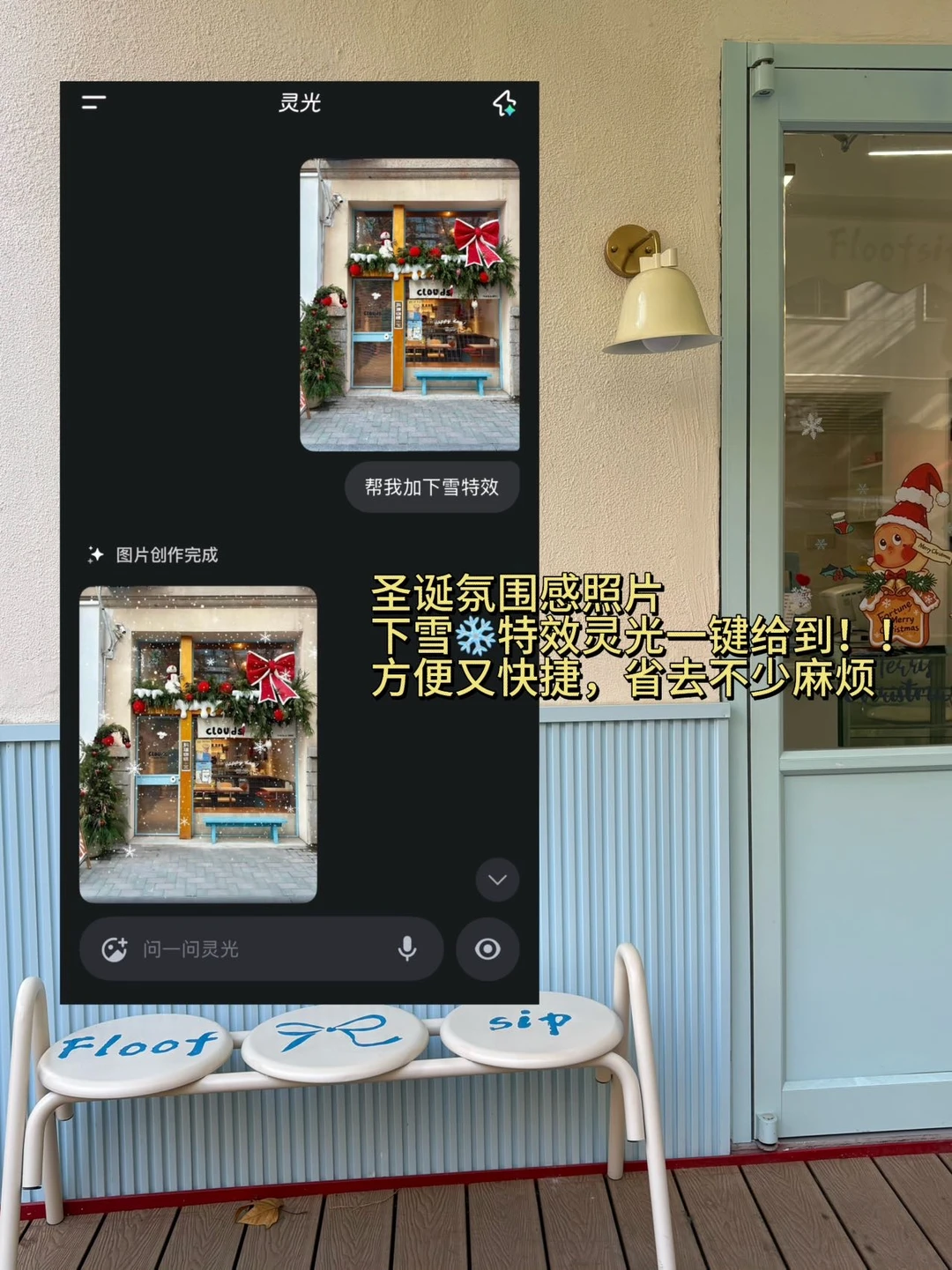 拍到的照片没有氛围,输入想加的特效,比如加上飘雪、彩带特效等,一键就能p好,效果很好很自然