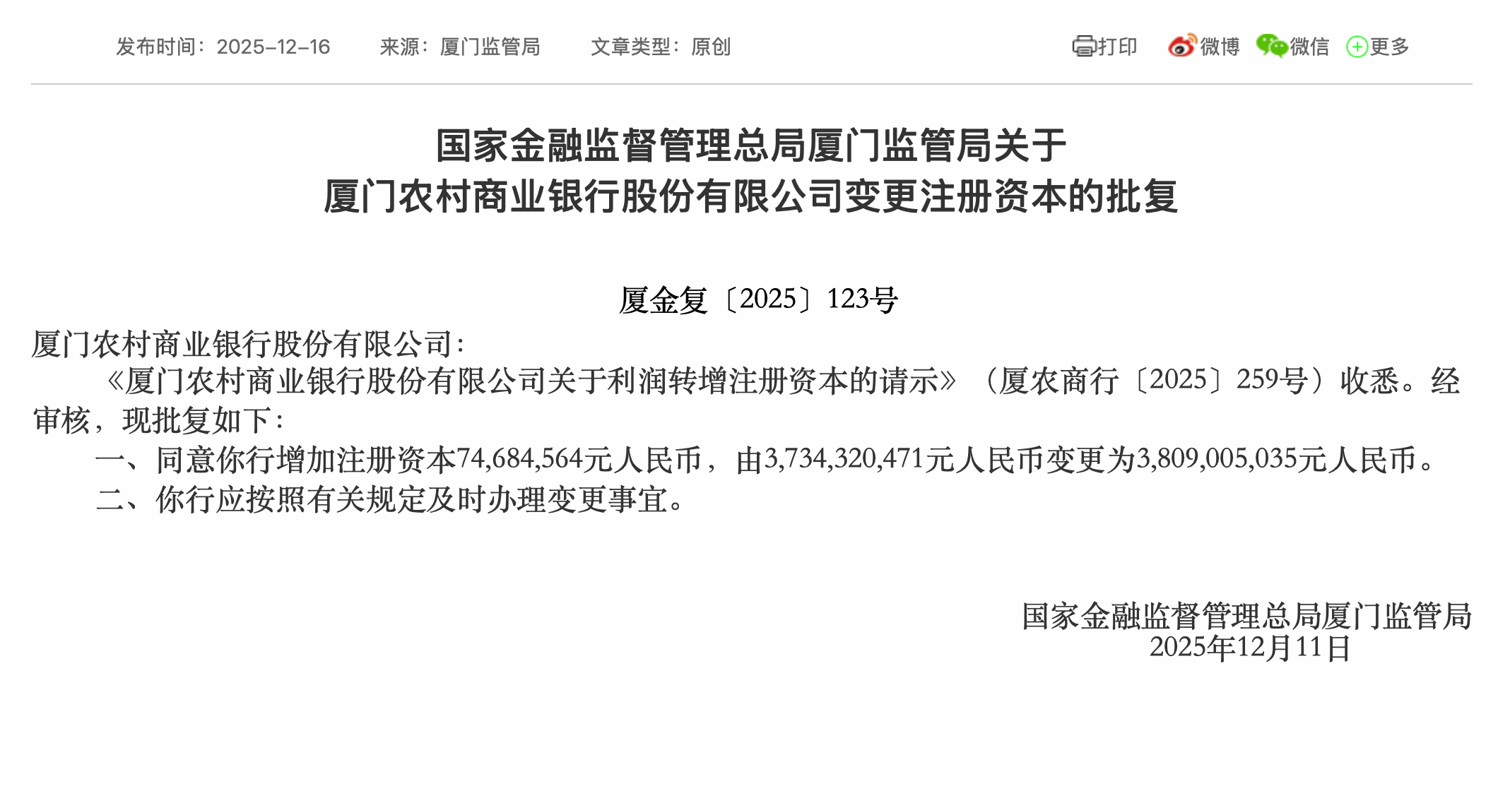 上证报中国证券网讯(记者徐潇潇)日前,国家金融监督管理总局厦门监管局发布了关于厦门农村商业银行股份有限公司变更注册资本的批复,经审核,现批复同意厦门农商行增加注册资本0.75亿元人民币,由37.34亿元人民币变更为38.09亿元人民币。