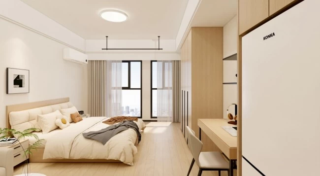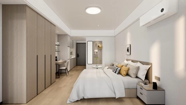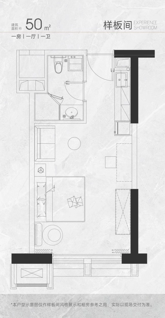 规划建面约50m²一室一厅一卫户型,格局方正,布局更高效,空间更舒朗;通过3种不同风格设计巧妙适配不同菁英人才的个性化需求,创住合一,兼具舒适感与艺术感,增设四季纳藏空间,在有限面积内创造出生活的无限可能。