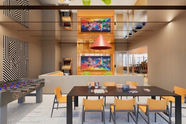 人才社区内注重空间的多功能性与流动性,建设约1500平方米多功能公区,涵盖共享厨房、咖啡吧、路演厅、研习室、白鹿湖书院、电竞房及轰趴馆等丰富配套,通过“非正式交流空间”,打造融汇工作、生活、学习与娱乐的复合型生态平台,为人才构建一个富有归属感、激发创新活力、促进情感连接、重塑高品质生活方式的社区精神场域。