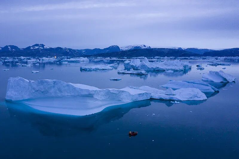 △当地时间2019年8月15日,格陵兰东部,一艘船在夜晚航行在巨大的冰山旁边。