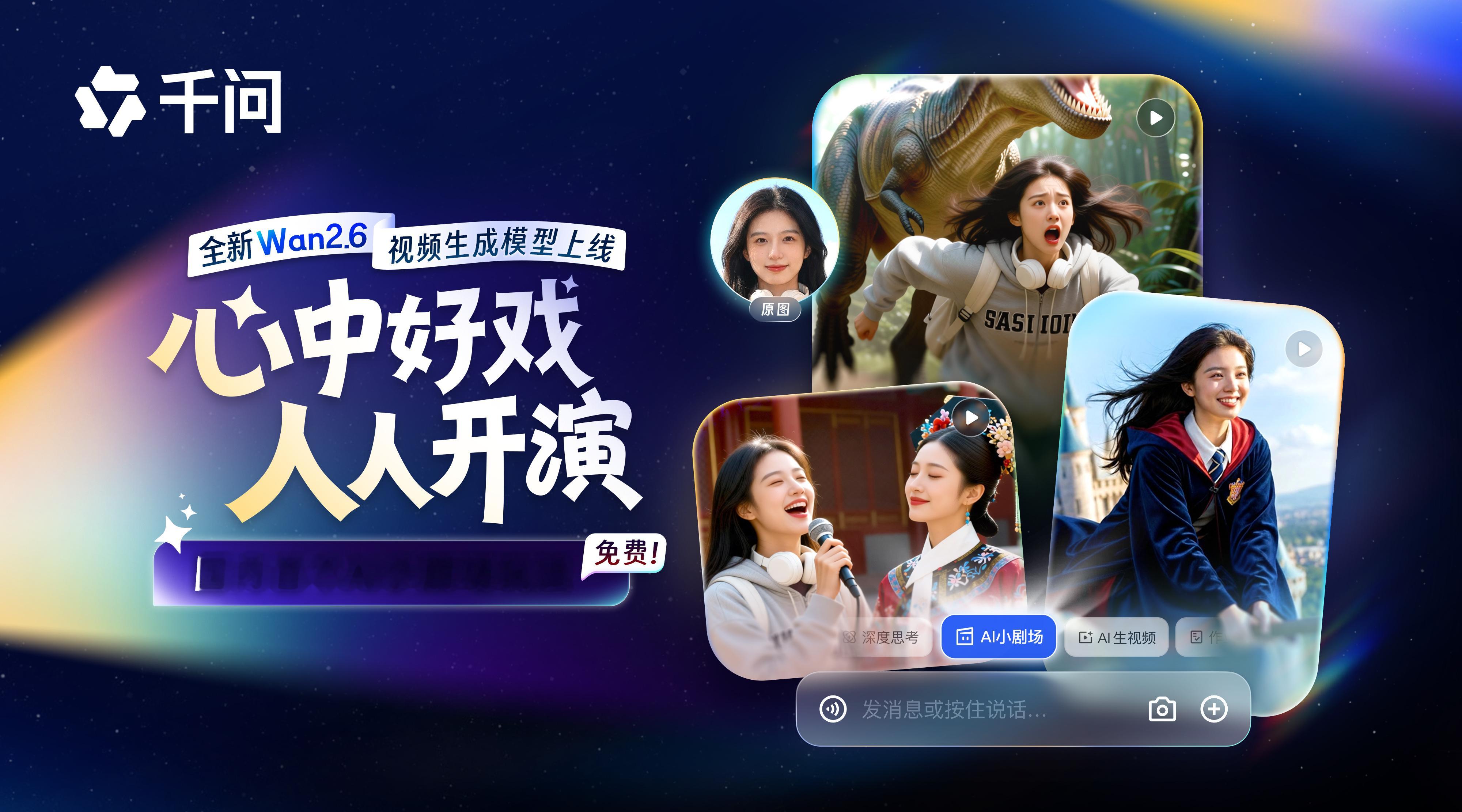 千问app视频生成能力更强了,上线最新Wan2.6视频生成模型,其完全由AI生成的电影短片在画面质感与叙事连贯性上展现了突破性的逼真度,将专业级影视输出一步带入可实践的创作现场。纵观影史,从默片至有声,从黑白至彩色,每一次技术跃迁都深刻重塑着视觉叙事的边界。如今,AI技术的介入,正如同为创作者提供了在数字片场中自由穿梭,让天马行空的想象得以直接投射于光影构成的舞台。千问所实现的音画同步的15秒长视频生成、智能多镜头语言切换以及基于音频的一键视频合成,其核心价值在于将对景别、构图、影调色彩的细腻美学控制权交还给了创作者,将创作者从繁复的技术实现流程中解放。从虚拟角色微表情的精准驱动,到符合视听逻辑的智能剪辑与转场,AI正持续降低影视制作的技术门槛,同时却无限拓展了艺术表达的维度。当精密的算法与人类的灵感邂逅,当庞大的数据与细腻的情感碰撞,影视创作迸发出前所未有的可能性。千问app让每位用户化身“绝对主控导演”。在此,无需纠结演员咖位与档期,从当红巨星到历史人物,从经典IP角色到原创形象,皆可随心调配。仅需输入指令,你构想中的形象便能即刻化身演员,精准演绎你脑海中的故事。模型强大的算力,正致力于将每一个动人的灵感,高效转化为可感、可知、具有情感流动的生动视听现场,让想象力的价值得以全面兑现。千问最新Wan视频模型能拍电影