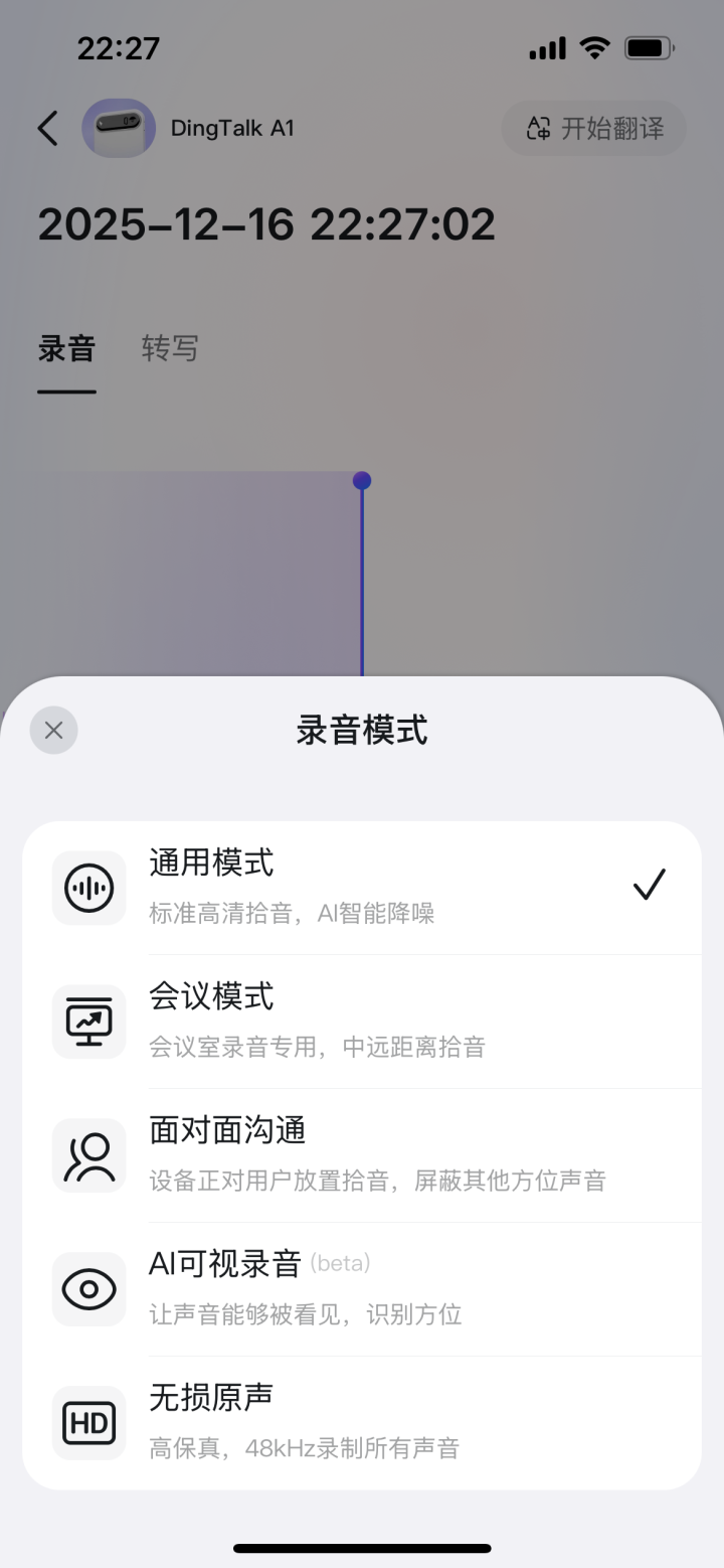 整体来说,录音效果很稳,人声录得很清楚,还自带了多种录音模式:通用模式、会议模式、面对面沟通、AI可视录音、无损原音等,比如会议模式支持中远距离识音。比如这次测试用的是会议模式。