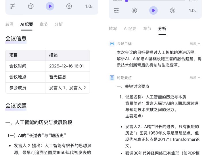 比较省心的是,会议纪要里不仅支持文字转写,同时可以形成AI纪要、章节和分析。如果还是有听不懂或看不明白的地方,可以点开页面右上角的“AI问答”,它可以帮你提炼会议重点、根据会议写一段群通知、按照发言人总结观点等。