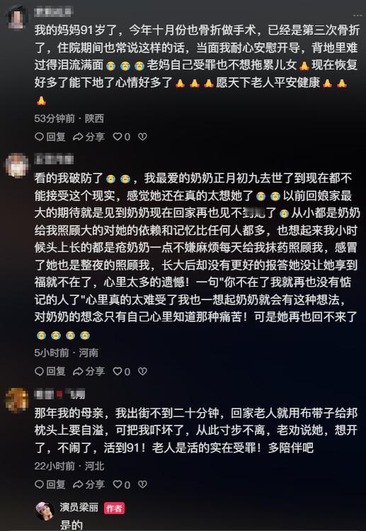 演员梁丽和92岁妈妈在家自导自演“自杀”情景剧,3分钟的视频里只听哭声不见眼泪,但观众很买账。 初看这个视频,还觉得梁丽发现的真及时,要不然后果不堪设想。 因为梁丽一进门,她92岁的妈妈正手拿着什么东西往嘴里塞,梁丽及时制止下来之后,硬掰开妈妈的手,发现是一大把药片。 接着就发现了妈妈藏在枕头下面的药瓶,仔细一看是一瓶安眠药。 在这种情况下,梁丽着急的询问妈妈为什么要这样。 妈妈犹豫一下之后,就慢慢把原因说了出来,一年之内梁丽妈妈骨折3次,如今92岁的她经常需要人照顾,所以她觉得自己是家里的累赘,故想出这样的下策。 知道原因之后,梁丽苦口婆心的劝说,说这都是他们应该做的,希望妈妈不要做傻事,不然让她怎么跟逝去的爸爸交代。 说着说着就开始有了哭腔,但是整整3分多钟的视频却只有哭腔,眼泪却不见流出来。 妈妈的状态也是看着十分木讷,只是动情之处,拿手擦拭眼睛。 到这,初看视频的网友也发现了不对,为什么妈妈喝药恰好能被记录下来,梁丽也是带妆出现。 直到看见视频下方标注的内容演绎,仅供娱乐的字眼,才知道视频是剧情演绎。 但明知是演绎,网友在评论区还是表示能够共情,纷纷分享了自己类似的遭遇。 确实,梁丽在家照顾母亲,闲余时间利用自己的专业拍摄一些小视频挺,既能让母亲打发时间又能提高点人气挺好。 只是,让92岁的妈妈拍摄这种“自杀”剧情,先不管心理上会不会觉得不适,悲伤的情绪也不太适合这个年纪的老人,会不会加重不适。 还是少拍这样的视频,多带母亲高兴高兴,有个好心情。