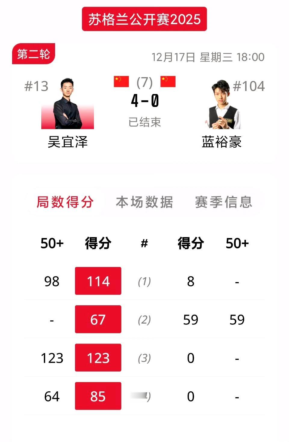 虎扑12月17日讯在2025斯诺克苏格兰公开赛32进16轮次的一场中国德比中,吴宜泽以4-0完胜新人蓝裕豪,晋级16强。