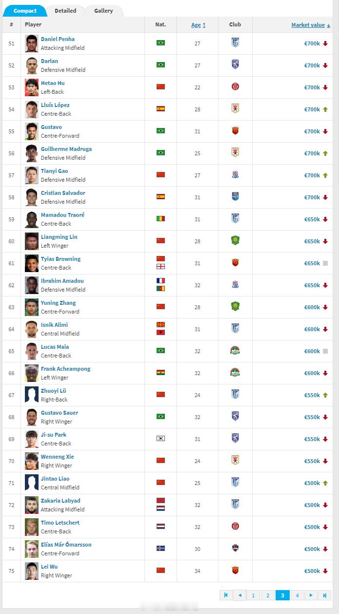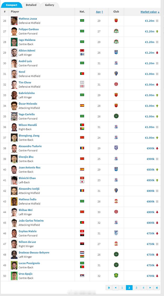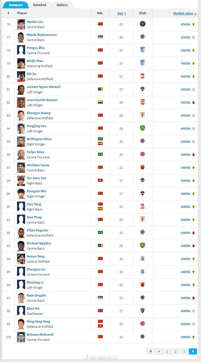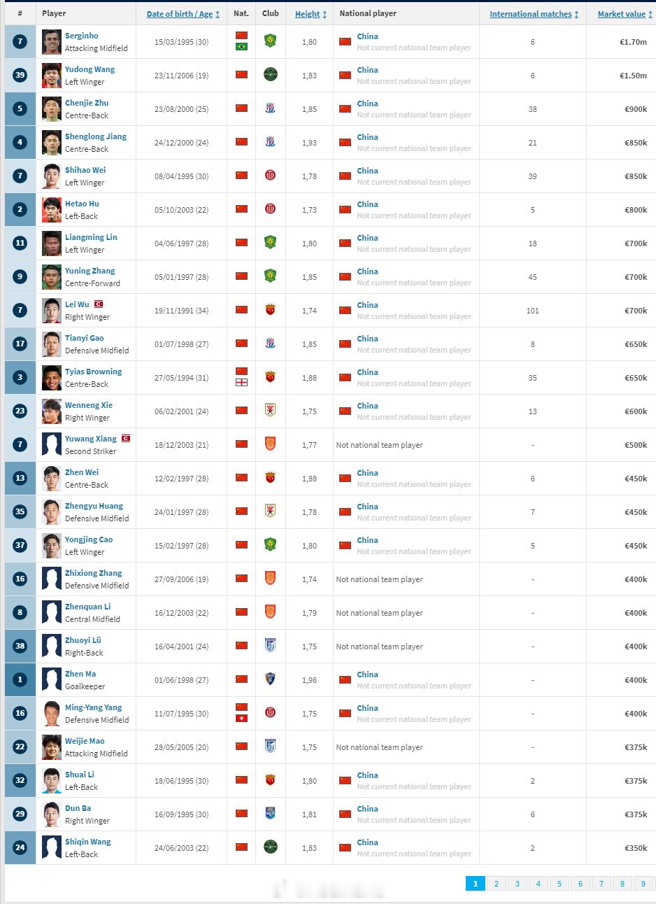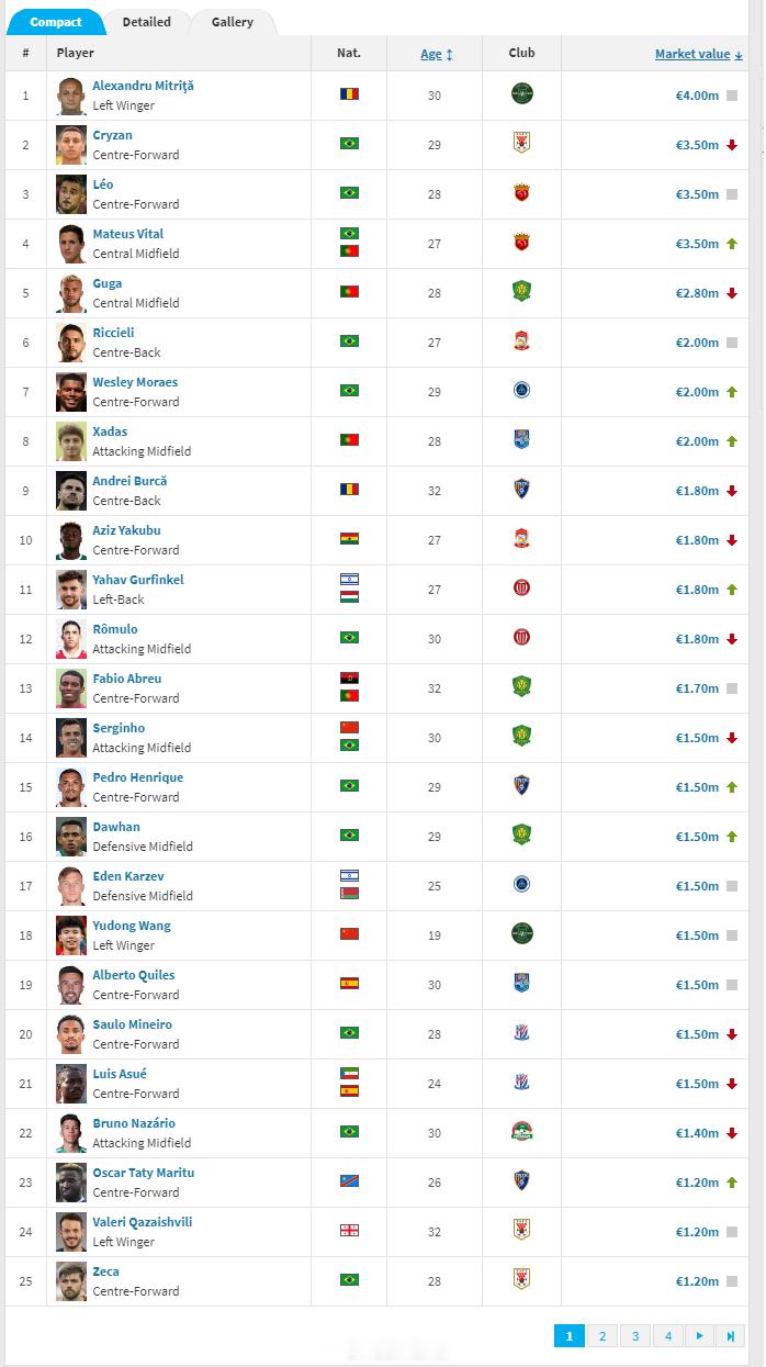 德国转会市场网(Transfermarkt.de)2025年中超联赛身价年终例行更新今天完成。球员方面,浙江队的米特里策身价维持在400万欧元,位于中超身价榜首位。山东泰山的克雷桑身价从400万欧降到350万欧,上海海港队的维塔尔则从200万欧上涨到350万欧,同为350万欧的还有上海海港的莱昂纳多,这三名球员并列身价榜第二名。北京国安的古加则从350万欧降到了280万欧,排名第五。青岛西海岸的里切利、深圳新鹏城的韦斯利、天津津门虎的哈达斯同为200万欧,并列第六。云南玉昆的布尔克、青岛西海岸的阿齐兹、成都蓉城的古尔芬克尔和罗慕洛四人同为180万欧,并列第九。此次更新完成后,塞尔吉尼奥和王钰栋同为150万欧,是目前中超身价最高的中国(港澳台除外)球员。蒋圣龙升到100万欧元,排在中超中国球员身价榜第三。朱辰杰以90万欧元排第四,韦世豪以80万欧元排第五,胡荷韬、高天意同为70万欧元,并列第六。林良铭、蒋光太同为65万欧元,并列第八。张玉宁降到60万欧元,排在第十。中超的港澳台球员身价方面,周定洋以100万欧元仍排第一。陈晋一身价再度上涨到85万欧元,是中超身价最高的中国香港球员。俱乐部身价方面,上海海港以1608万欧元排在全联赛第一,上海申花以1281万欧元排第二,北京国安以1276万欧元排第三,山东泰山以1158万欧元排第四,浙江以1155万欧元排第五,成都蓉城以1051万欧元排第六,其余球队均低于1000万欧元。