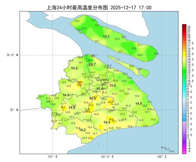 受辐射降温影响,今天早间全市最低气温城郊差异明显,市区徐家汇站9.4度,郊区大多在2~10度之间,金山2.0度为最低。受冷空气扩散影响,白天多云天气为主,午后天空渐渐打开,阳光露脸。最高气温较昨日小幅下降,全市在12~15度之间,市区徐家汇站13.4度。空气仍旧比较干燥。