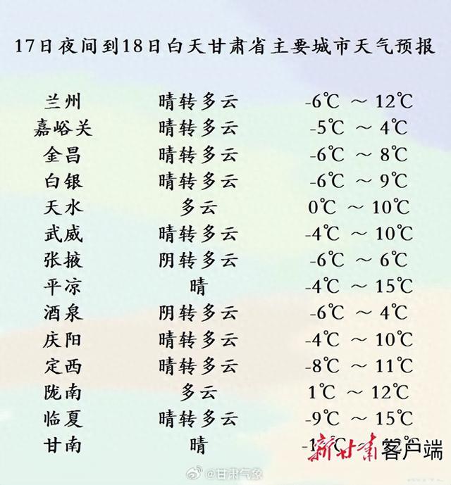 甘肃省气象局发布《甘肃省气象信息专报》提示:受中等强度冷空气影响,12月18日夜间至20日我省有降雪、降温天气。河西五市及甘南、陇南等州市部分地方有小雪,酒泉市南部山区有中到大雪。