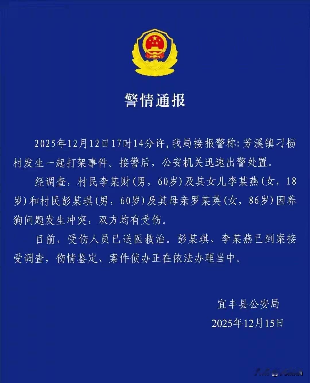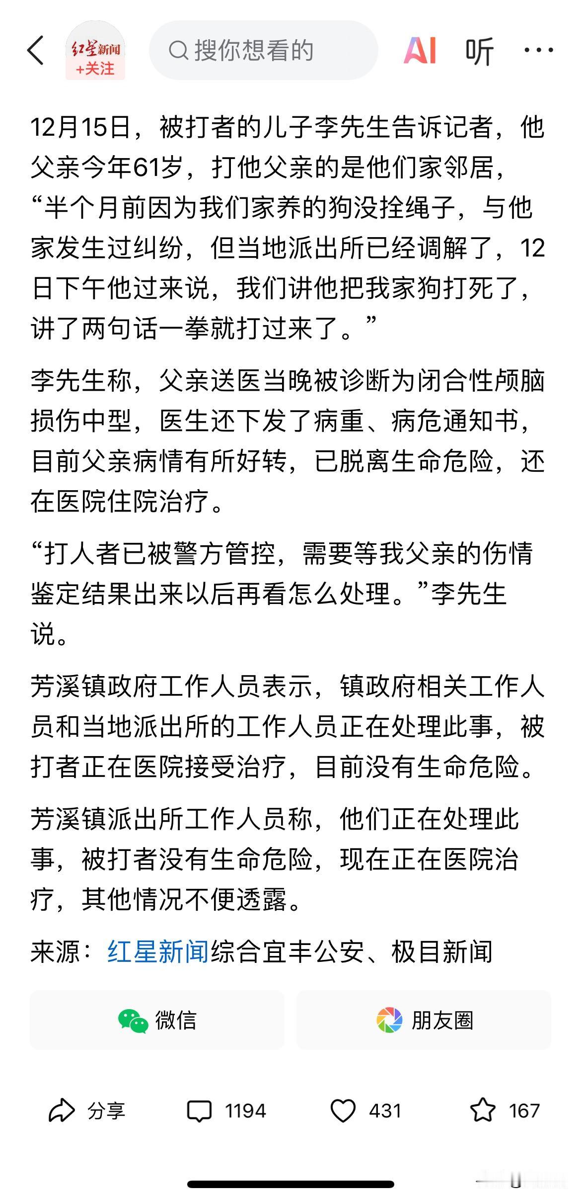 果然没那么简单!江西宜春,60岁老人在家门口被邻居一拳打倒在地,陷入昏迷,家属控诉:不止一次殴打,父亲有残疾,经常趁他一个人在家动手。 警方通报4人因养狗问题产生冲突,包括打人者和其母亲,被打者和其女儿,双方都有受伤,看来远不止视频看到的那么简单。 半个月前,两家因为被打者的狗没拴绳有纠纷,当时派出所出面调解才和解,这次是邻居认为被打者散播他打死他家狗的谣言,一怒之下,直接上门打人,看来当时的和解只是面和心不和。 真的应了那句“打输了住院,打赢了坐牢”。被打者颅脑损伤,一度下病危通知书,目前还在院治疗;邻居因故意伤人被拘留,被打者家属称不会妥帖,会追究责任。 本该是远亲不如近邻,因为养狗问题闹僵,从视频也能看到被打者家里至少养了5条狗,邻居上门的时候狗都还冲上前吠叫。养狗不栓绳,真的对怕狗人士来说,很吓人,不知道什么时候会冲上来咬一口。 邻居因为这事也跟养狗者闹过矛盾,估计也每天深受其害,忍受狗叫,还要担惊受怕哪天被咬。 被打者家属称父亲有残疾,邻居三番五次殴打,欺负他们老实,村委也多次调解。 同为邻居抬头不见低头见,多点理解和包容,多点互帮互助,不是更好吗?弄得现在一伤一拘留,真是得不偿失!