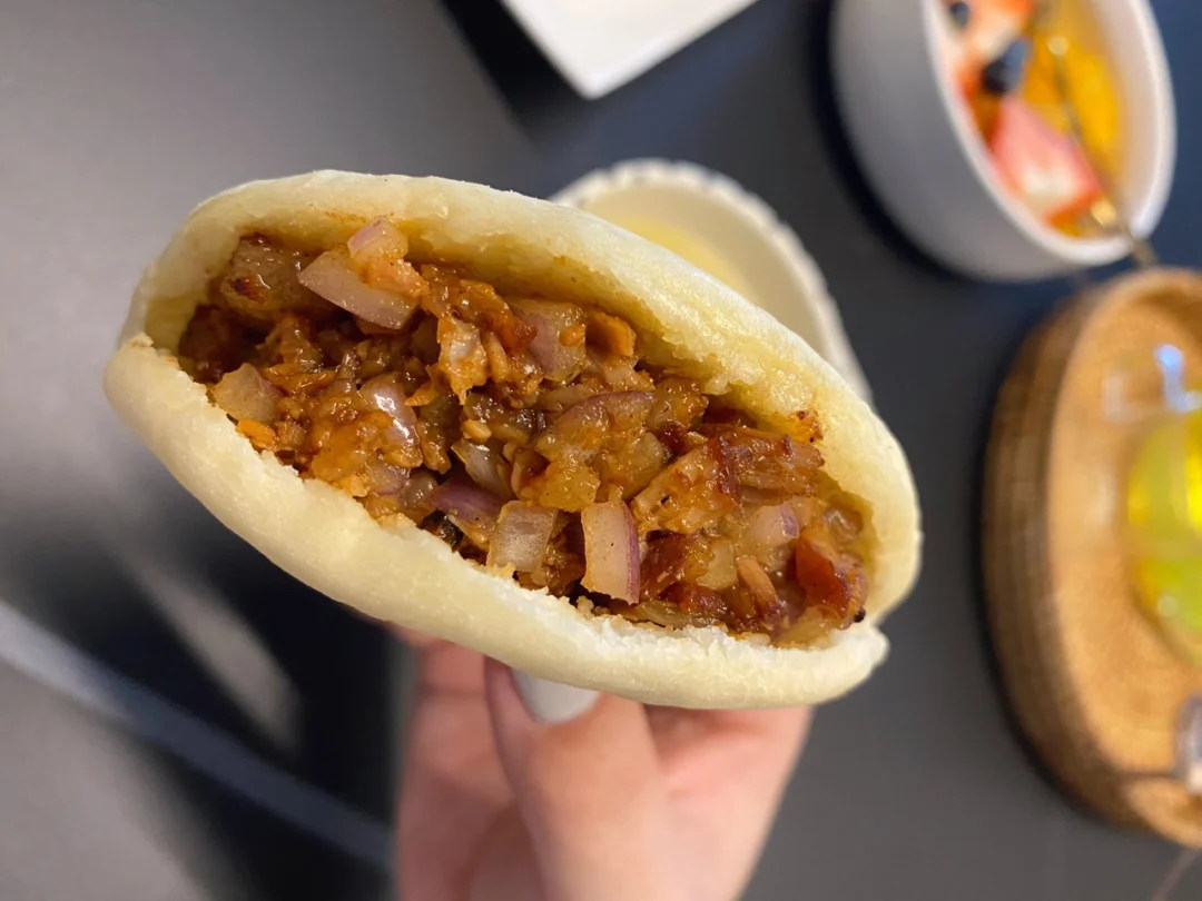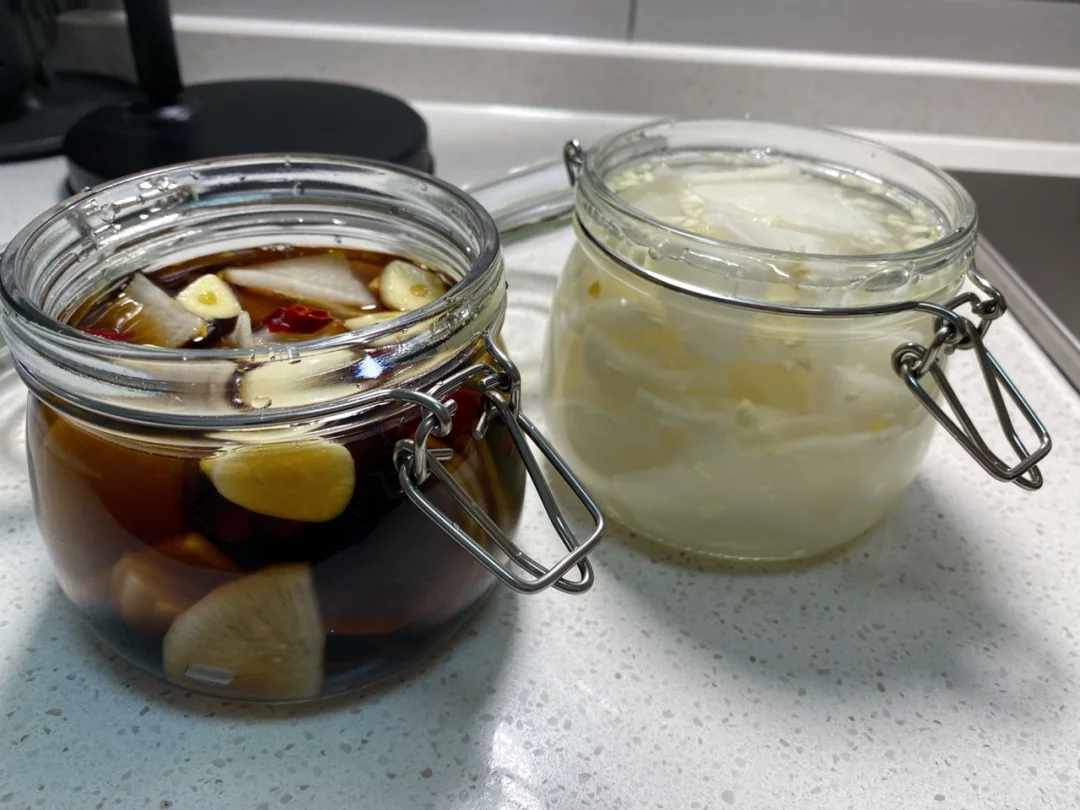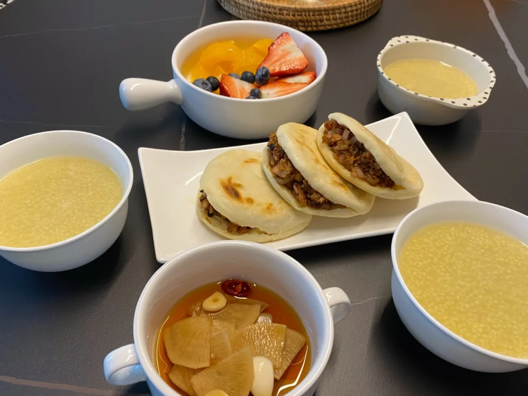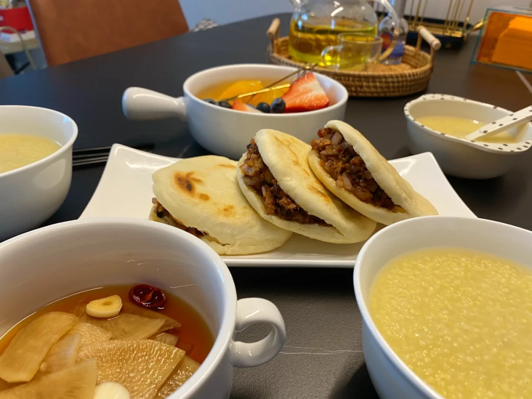 起晚了~变成早午饭[偷笑R] 昨天晚上的红烧肉今天早上变成了肉夹馍~ 好久没有喝小米粥啦~ 昨天腌的萝卜~酸辣爽口真好吃 完美~