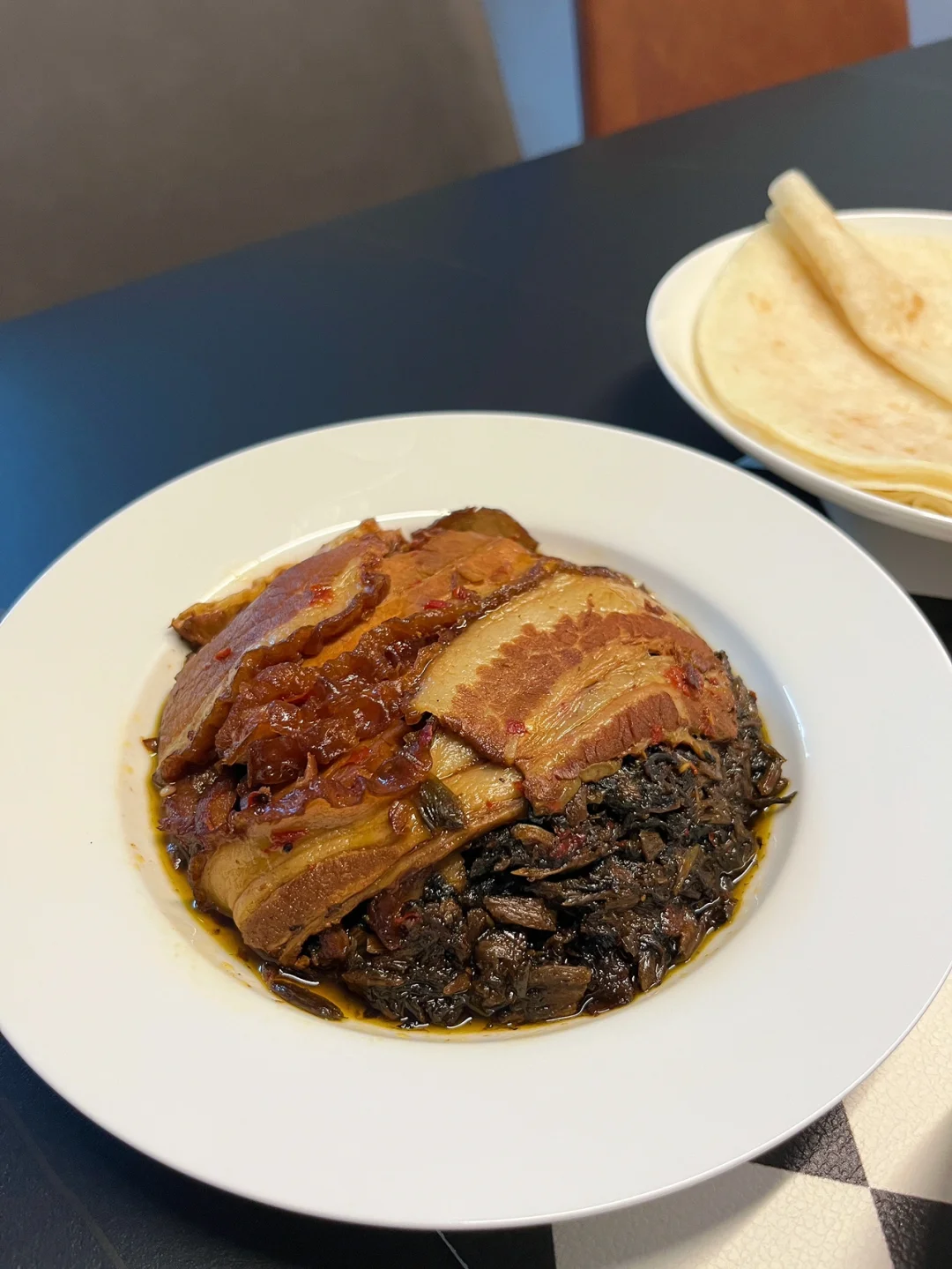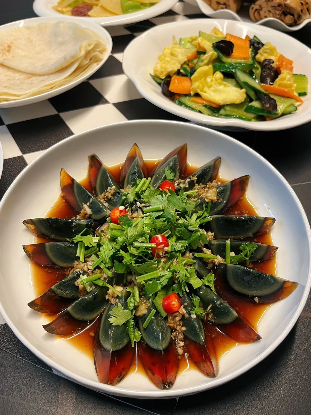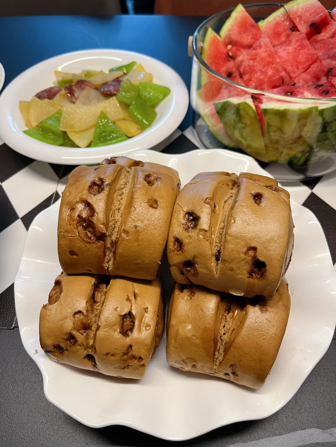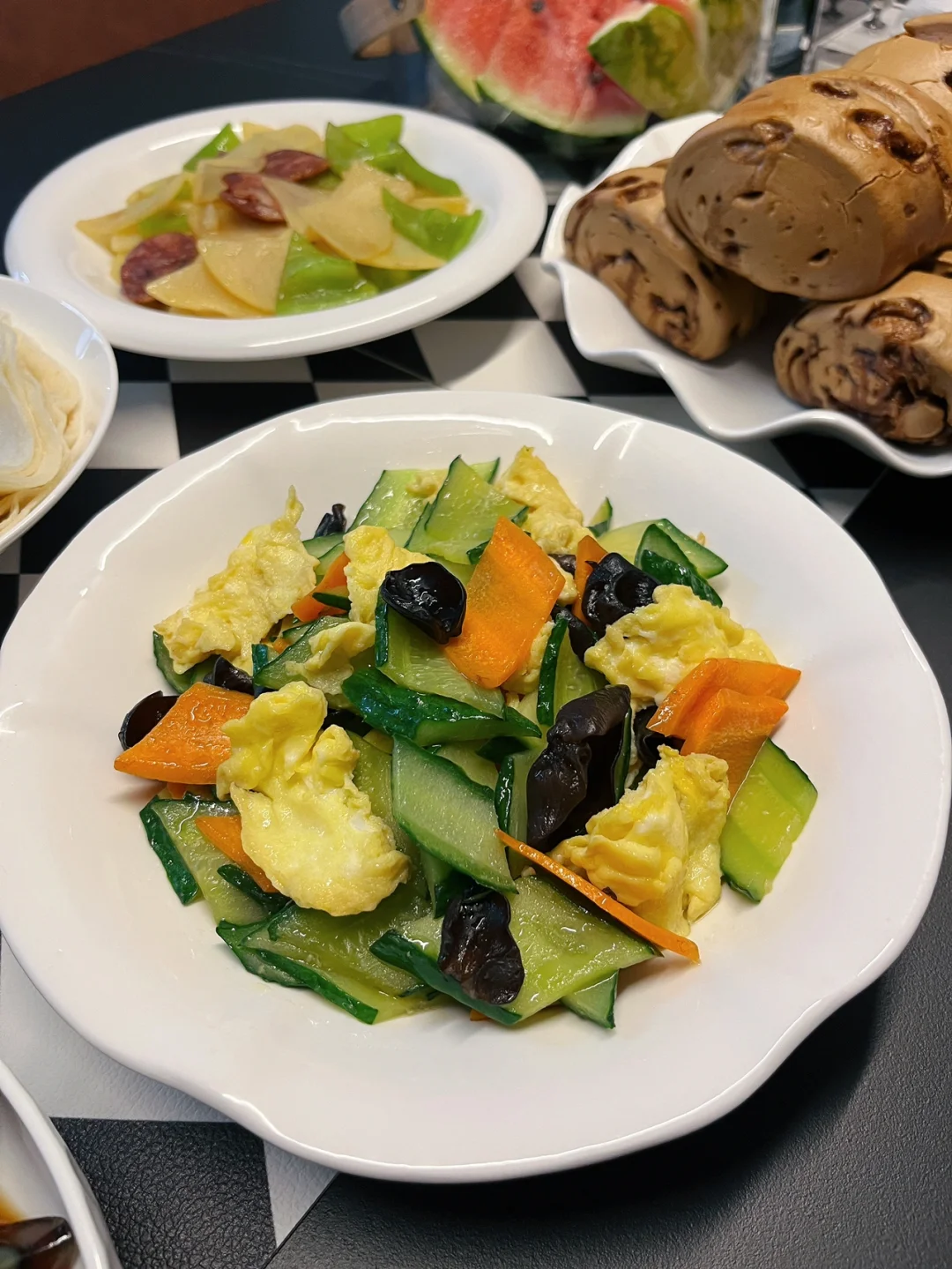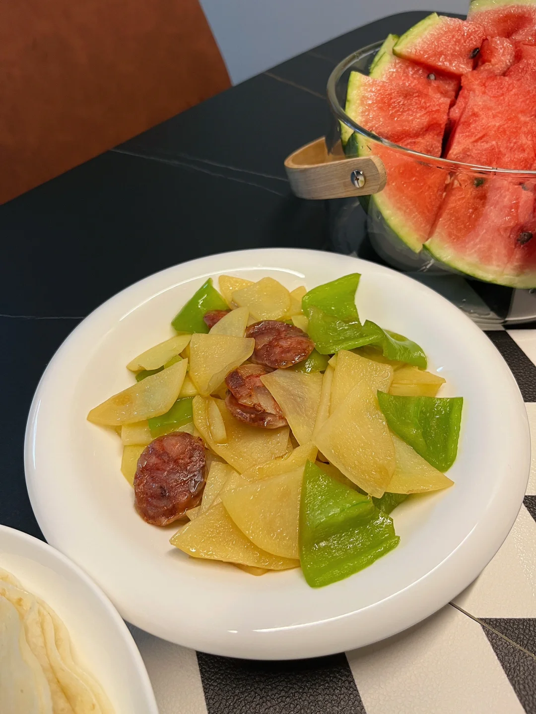 吃饭啦! 晚餐打卡:腊肠士豆片,木耳鸡蛋炒黄瓜,姜汁 皮蛋,梅菜扣肉,主食春饼和红糖馒头,水果西 瓜~ 啥也不说了,爱都藏在碗里🥢