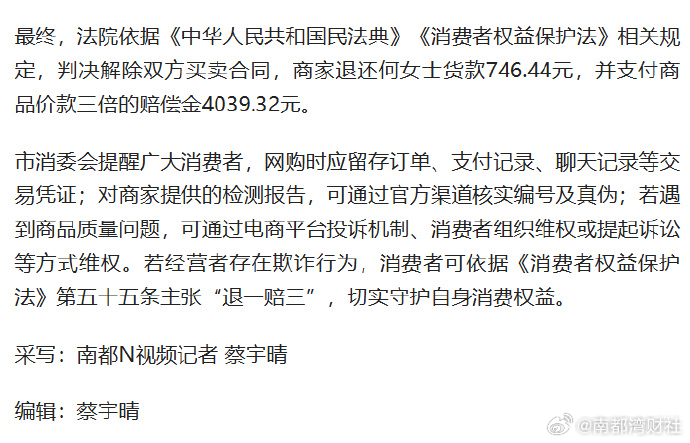 #网购靠椅甲醛超标商家P图造假#【网购靠椅甲醛超标,商家伪造报告涉嫌欺诈被判“退一赔三”】网购靠椅异味难消,商家出示的“合格检测报告”竟系伪造。近日,经深圳市消费者委员会协助维权,这起网络购物消费欺诈案尘埃落定,法院判决商家退还消费者部分货款并支付三倍赔偿金,切实维护了消费者合法权益。2025年3月底,消费者何女士在淘宝“金某办公家具工厂”花费1346.44元购买3张靠椅,收货后发现产品存在明显异味,长期不散。何女士向商家反馈后,对方称异味属“出厂正常情况”,并提供了一份标注“检验结论:合格”的检测报告,拒绝退款。协商无果后,何女士向深圳市消委会提起投诉。市消委会介入调查后发现,商家提供的检测报告与“国家家具产品质量检验检测中心(江西)”官网查询到的对应编号报告结论严重不符,原报告明确标注甲醛释放量“不合格”,商家涉嫌通过P图篡改报告结果。鉴于证据确凿,市消委会协助何女士提起诉讼。法院审理认为,商家明知商品质量不合格,仍伪造检测报告虚构合格事实,故意隐瞒真实情况,已构成消费欺诈,同时案涉商品不符合质量标准,导致合同目的无法实现,构成根本违约。最终,法院依据《中华人民共和国民法典》《消费者权益保护法》相关规定,判决解除双方买卖合同,商家退还何女士货款746.44元,并支付商品价款三倍的赔偿金4039.32元。