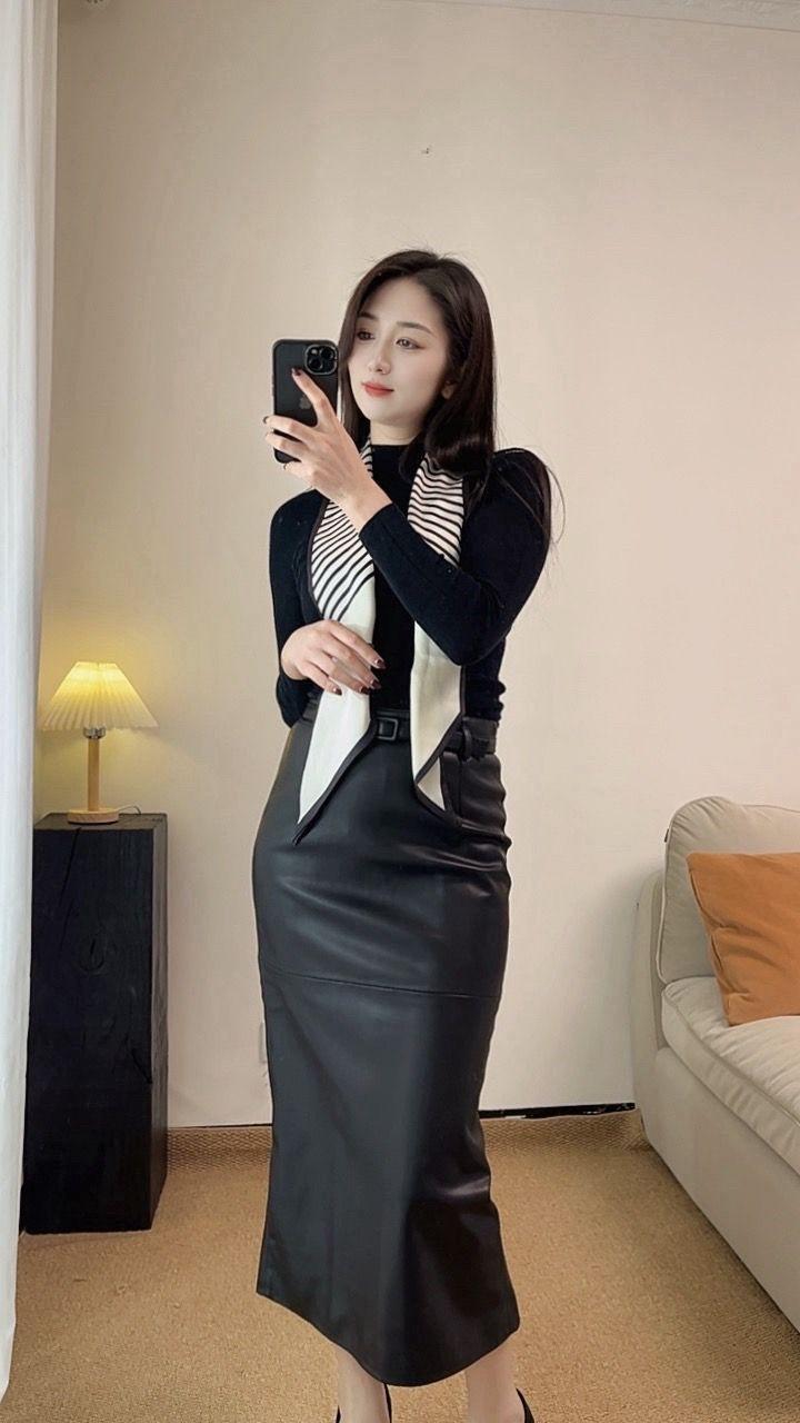 优雅穿搭指南:黑色皮裙搭配条纹背心,尽显时尚魅力!