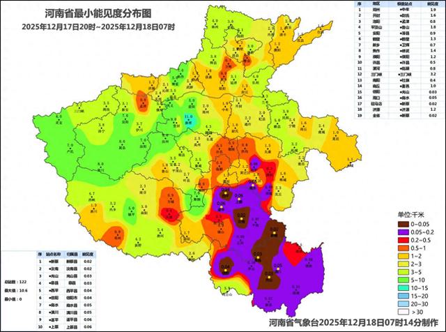 大河网讯(记者莫韶华)12月18日,据河南省气象台监测数据显示,17日20时至18日7时,我省东部、南部出现大雾天气。其中周口、驻马店、信阳最低能见度小于等于200米,部分县(市、区)小于等于50米。最低能见度前三站分别为:新蔡18米、汝南22米、光山26米。