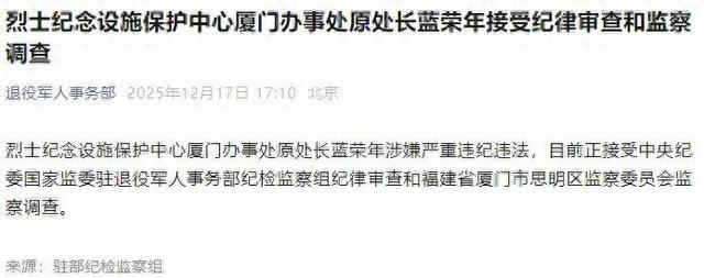 烈士纪念设施保护中心厦门办事处原处长蓝荣年涉嫌严重违纪违法,目前正接受中央纪委国家监委驻退役军人事务部纪检监察组纪律审查和福建省厦门市思明区监察委员会监察调查。