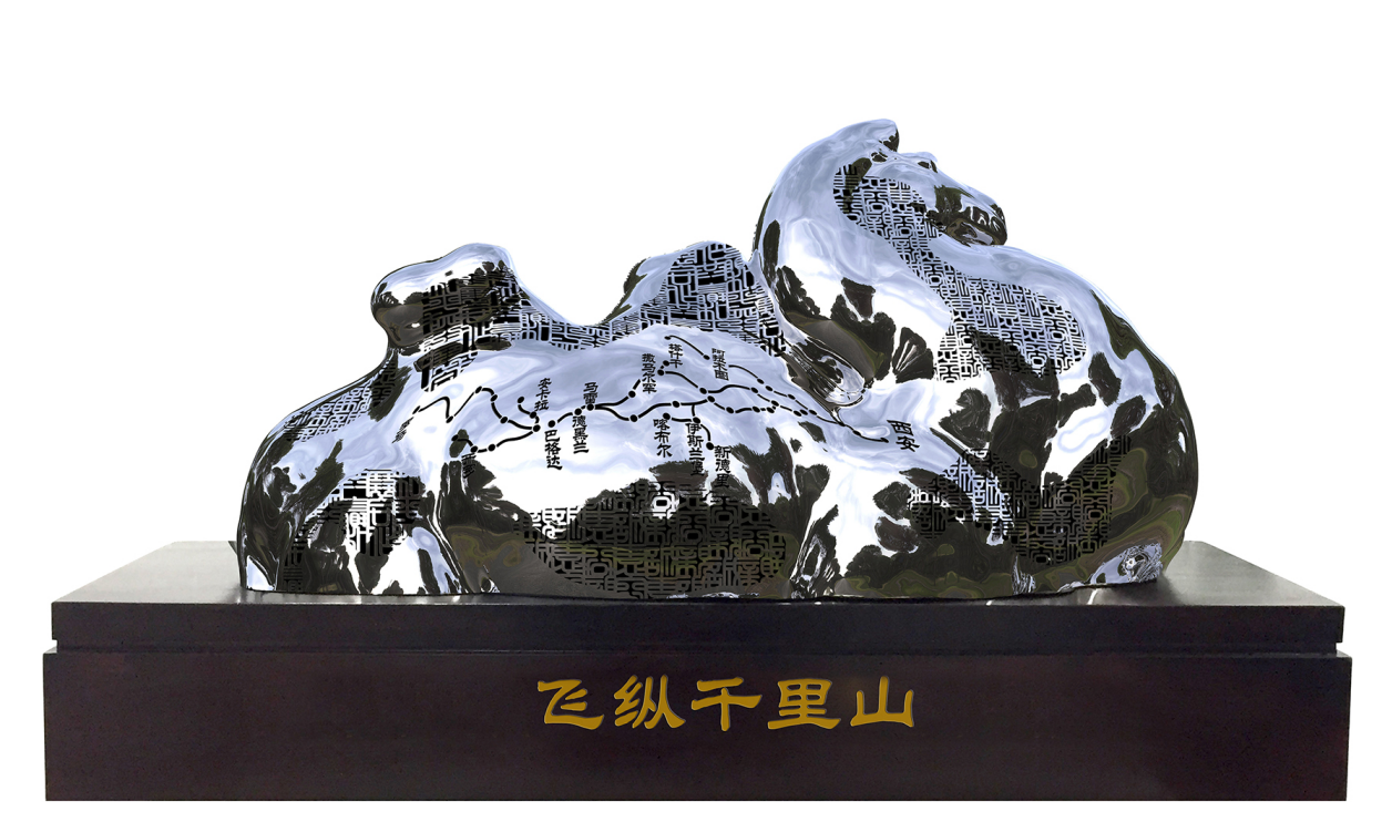 那件名为《飞纵千里山》的骆驼雕塑,是她和团队的得意之作:曲腿静卧的骆驼翘首远眺,仿佛正准备踏丝绸之路的风沙,篆书雕刻的“和平发展、合作共赢、亲诚惠容”外交方针与清晰的丝路路线图,在石面上静静流淌着东方智慧。2015年,这件作品的原型作为国礼赠予哈萨克斯坦总统,让西安的文化匠心走向了世界。