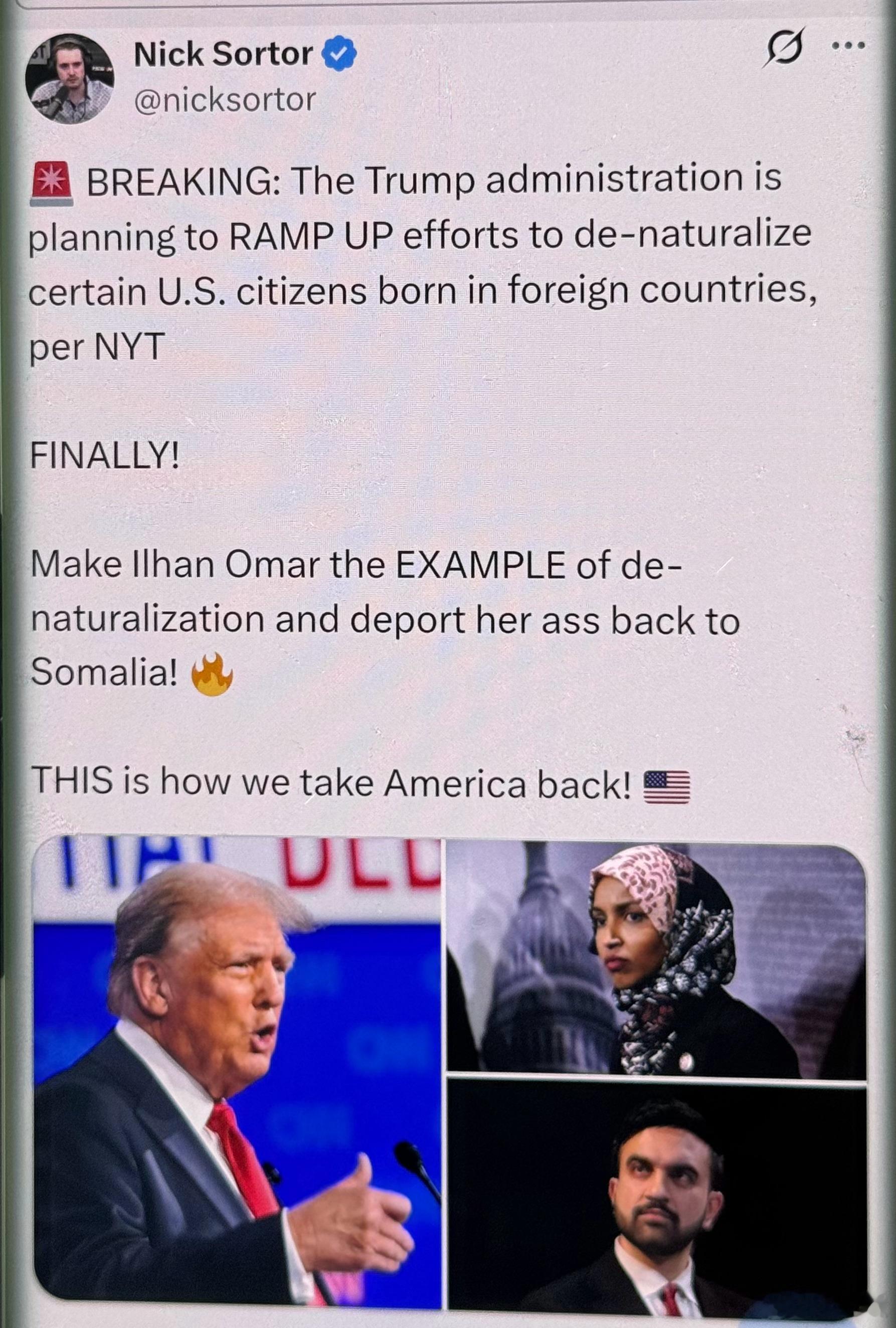 突发消息:据《纽约时报》报道,特朗普政府正计划加大力度,撤销部分在外国出生的美国公民的国籍。终于等到了!就拿伊尔汗·奥马尔开刀,撤销她的国籍,把她遣返回索马里去!这才是我们夺回美国的正确方式! 慧眼辣评 :明眼人一看就是假消息!如果是纽约时报报道的,美国政府应该起诉纽约时报!