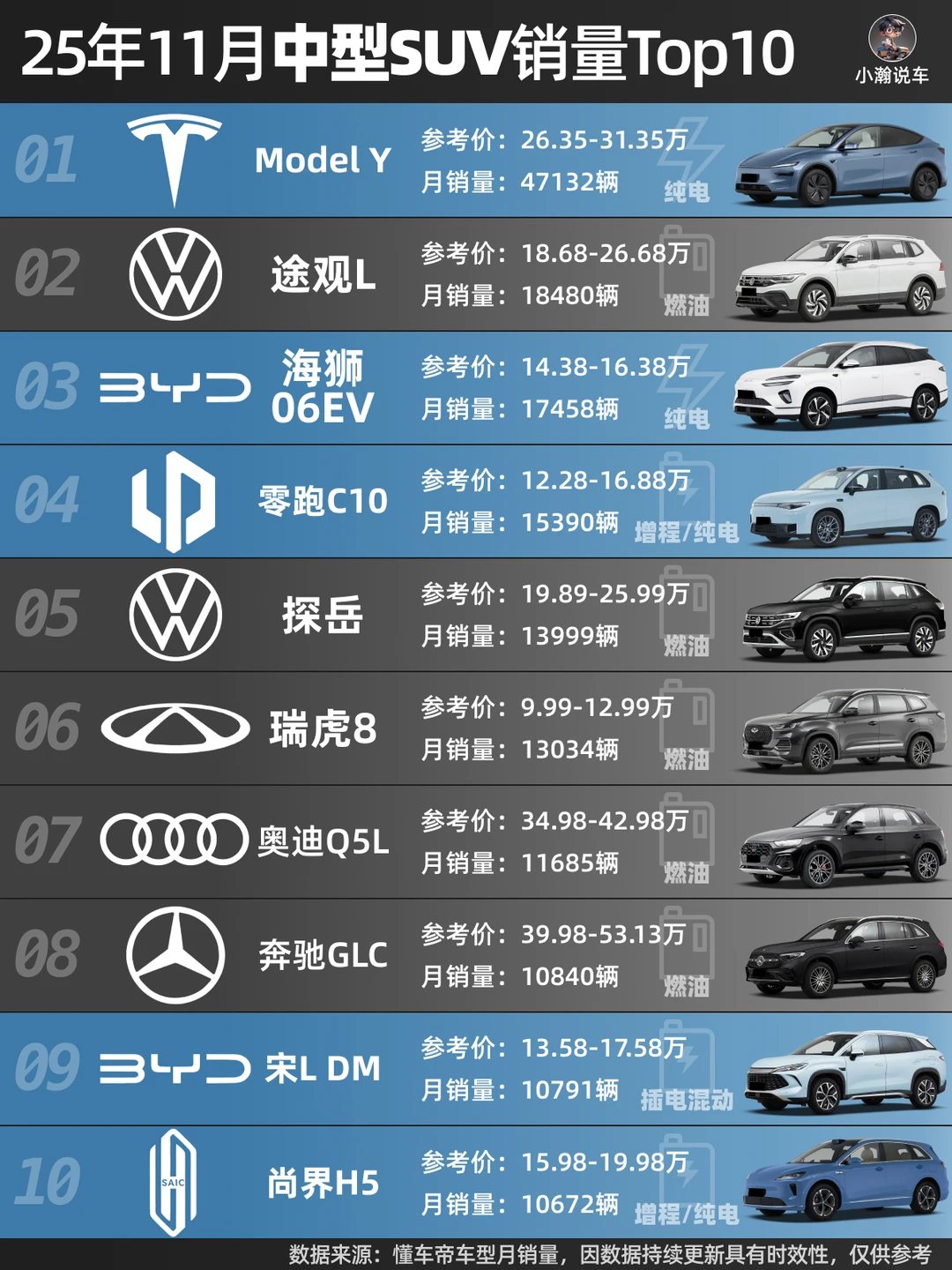🌟中型SUV:Model Y销量突破4.7万,一扫上月跌破2万的阴霾。比亚迪海狮06EV重回前3,自家另一款宋L DM升至第9。上汽和华为合作的尚界H5月销过万,冲上榜单。