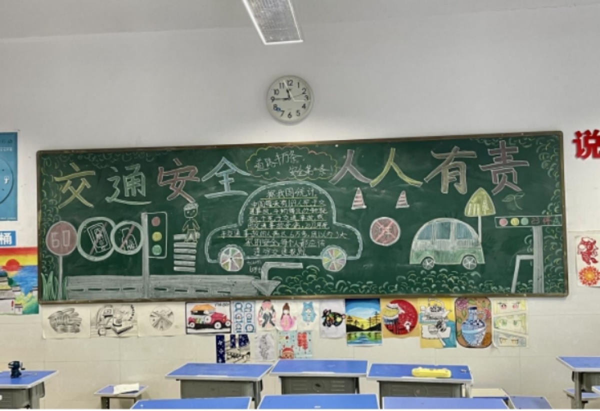 视听浸润,多维宣传营氛围。充分发挥校园各类宣传载体的阵地作用,营造“抬头可见、驻足可听”的浓厚氛围。电子显示屏滚动播放“一盔一带、安全常在”朗朗上口的宣传标语与生动警示短片,在师生每日必经之处强化视觉提醒。校园广播站开设“平安上学路”专题栏目,定时播报安全知识、法规解读及温馨提示,让安全之声回荡校园。同时,精心绘制主题黑板报,以童趣的画笔图解交通标志、宣传安全常识,打造班级内“会说话”的安全文化墙。