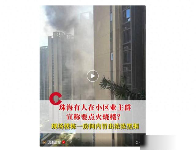12月18日,网传珠海一小区有人纵火。据业主群聊天记录显示,一名业主突然在业主群发言,要点火烧房子,请1单元的业主全部离开,之后还发图称已经烧起来了。另有网传视频,楼栋一房间内冒出黑烟。事后,该业主在群里留言称,“不好意思,因我抽烟喝醉酒了,点着了。”