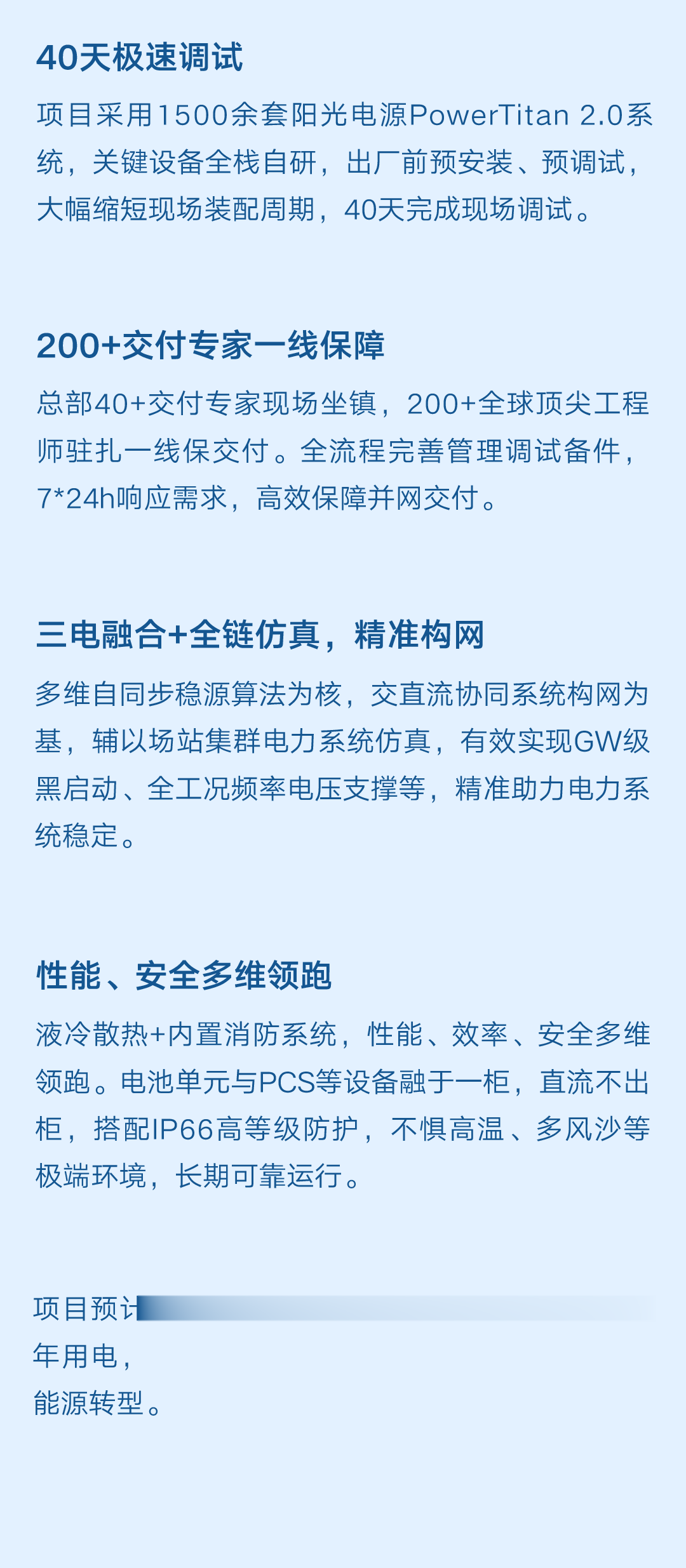 阳光电源称,本项目下单生产至出厂发货仅用时58天。项目采用1500余套阳光电源PowerTitan2.0系统,关键设备全栈自研,出厂前预安装、预调试大幅缩短现场装配周期,40天完成现场调试。
