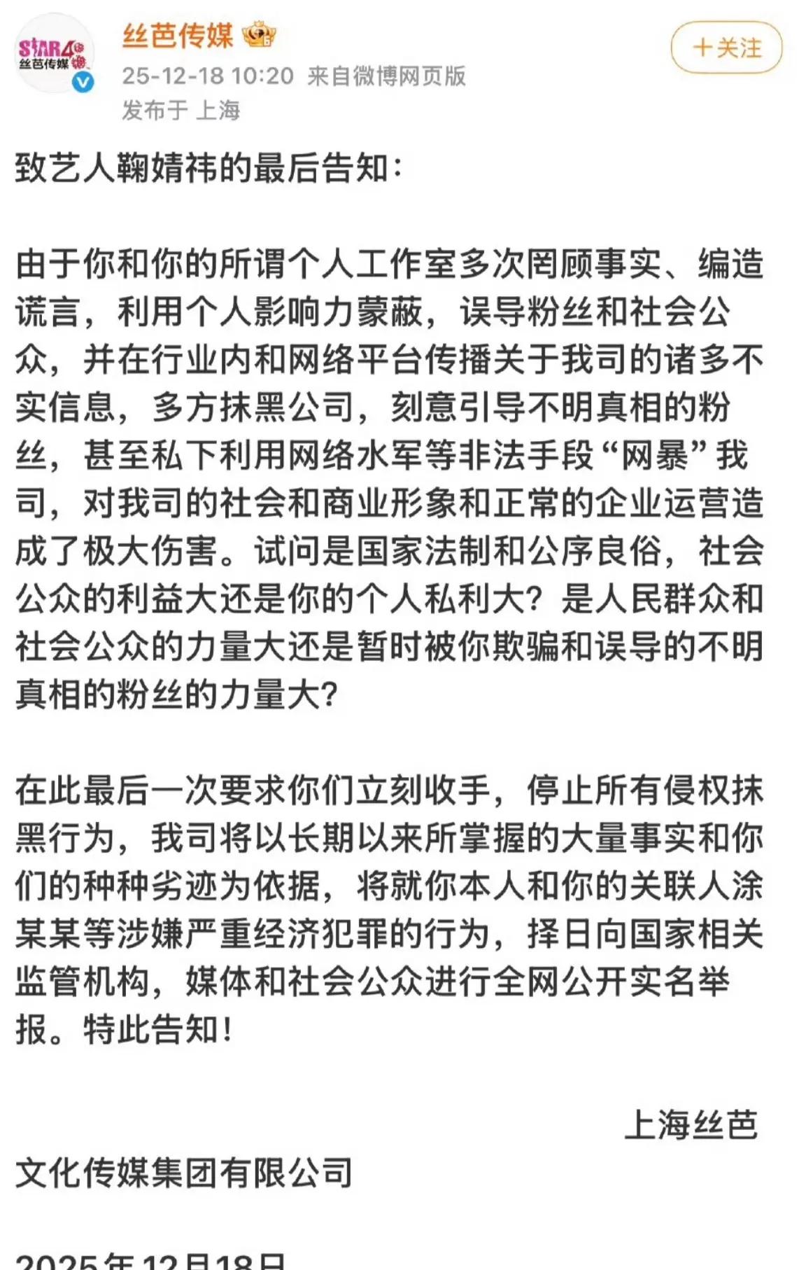 站在丝芭传媒和鞠婧祎的角度就是自己没错,错的是对方。 丝芭传媒觉得是我把你捧红了,花重金为你打造《芸汐传》把你捧成一线女明星,如果没有我你红不了,现在还不知道在哪里上班呢,没想到你现在红了以后就想飞了,所以死活都不想和鞠婧祎解约,不想放弃她这颗“摇钱树。” 站在鞠婧祎的角度就是,我现在大红了,是一线女明星了,你给钱少了,不符合我的身份,我要跳槽到福利更好公司。 所以双方现在才会闹成这样,曾经的“伯乐和千里马”现在要对簿公堂了,一开始合作的他们怎么也不会想到多年以后他们会变成像仇人一样。 就是不知道丝芭传媒今天威胁鞠婧祎方要爆料她和徐某某涉嫌犯经济罪的大瓜还爆不爆了?