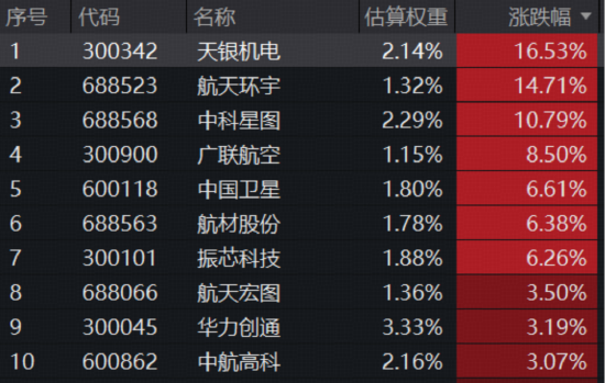 成份股方面,50只成份股中七成收涨,天银机电盘中一度20cm涨停,最终收涨16.53%,航天环宇涨超14%,中科星图涨超10%,广联航空涨超8%,中国卫星、航材股份、振芯科技涨超6%。