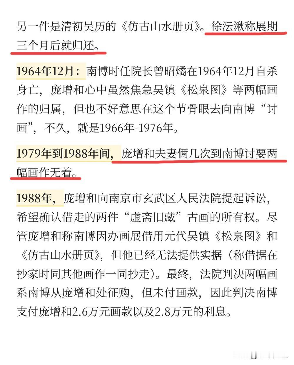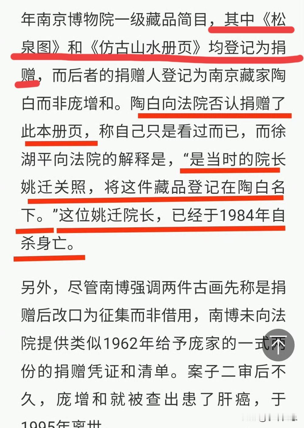 南博这事越闹越大了。 网友扒出和捐赠有关的两任院长, 都因为某些原因自杀了。 第一个是曾昭燏(曾国藩后代)【图一】。 1959年,她作为当时南博的院长,接受了庞家的捐赠。为了表示感谢,她设宴款待,为已去世的庞莱臣做冥寿生日。也因此她被扣上搞大吃大喝和搞封建迷信的帽子。1964年,她在南京灵谷寺跳塔自杀,终身未婚。 第二个是姚迁【图二】。 曾昭燏死后,姚迁接任院长。当年庞家“借”了两幅画给南博展览,南博不还,庞家索要无果。后人调查时发现,这两幅画以其他人的名义“捐”给了南博。工作人员说是在姚迁的关照,才这样做的(图三、四)(信源来自澎拜新闻独家)。 而馆长姚迁因为坚持追讨被“借走”的珍贵字画文物,1984年被逼上吊自杀。1985年才获得平反。 南博两任馆长接连自杀, 真是让人唏嘘……