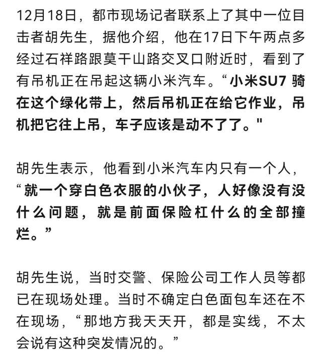 12月17日,有多位网友发布视频,称在浙江省杭州市拱墅区石祥路和莫干山路交叉口附近,一辆小米SU7新能源汽车发生事故,冲进马路一旁的绿化带,撞上桥墩。