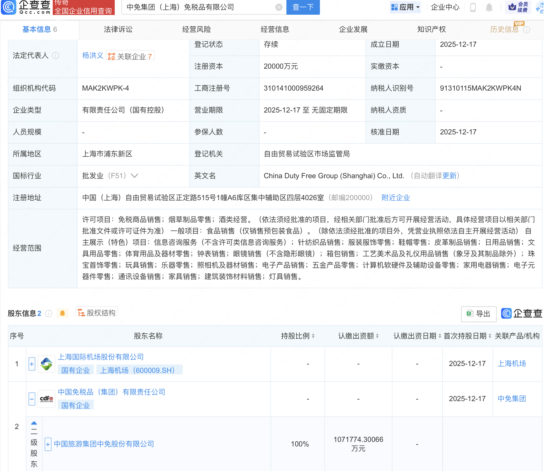企查查APP显示,近日,中免集团(上海)免税品有限公司成立,注册资本2亿元,经营范围包含:免税商品销售;烟草制品零售;酒类经营;皮革制品销售等。企查查股权穿透显示,该公司由上海机场(600009)、中国中免(601888)全资子公司中国免税品(集团)有限责任公司共同持股。