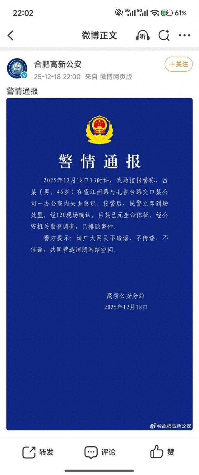 2025年12月18日13时许,我局接报警称,吕某(男,46岁)在望江西路与孔雀台路交口某公司一办公室内失去意识。接警后,民警立即到场处置。经120现场确认,吕某已无生命体征。经公安机关勘查调查,已排除案件。