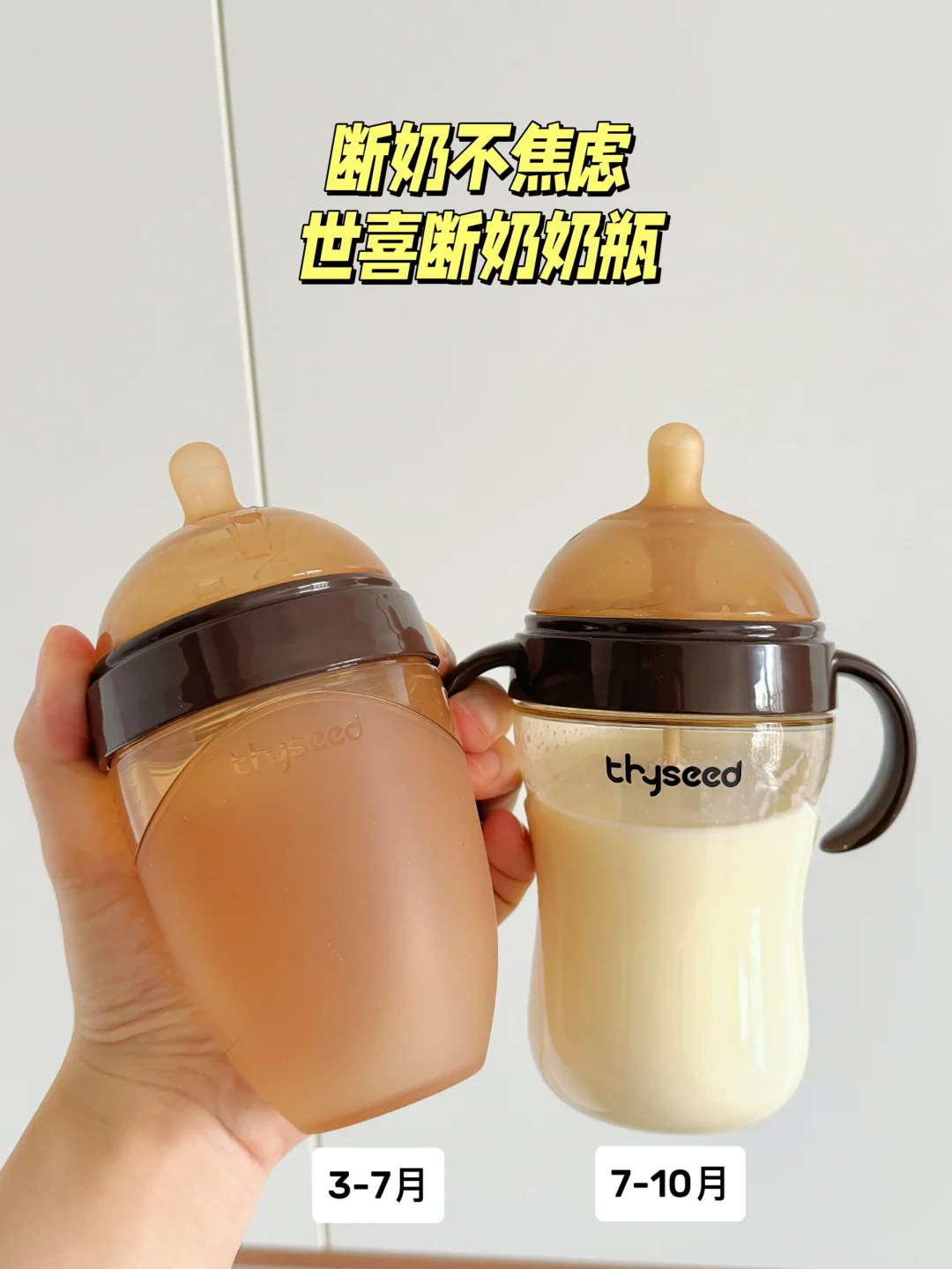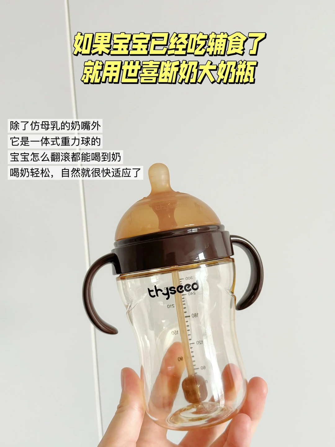 5、如果宝宝吃辅食了,你就买👉世喜断奶大奶瓶,这个是搭配了重力球的,宝宝怎么翻腾都能喝到奶,它的手柄是前倾15°的,宝宝抓握不费力,喝奶轻松,自然就不抗拒了