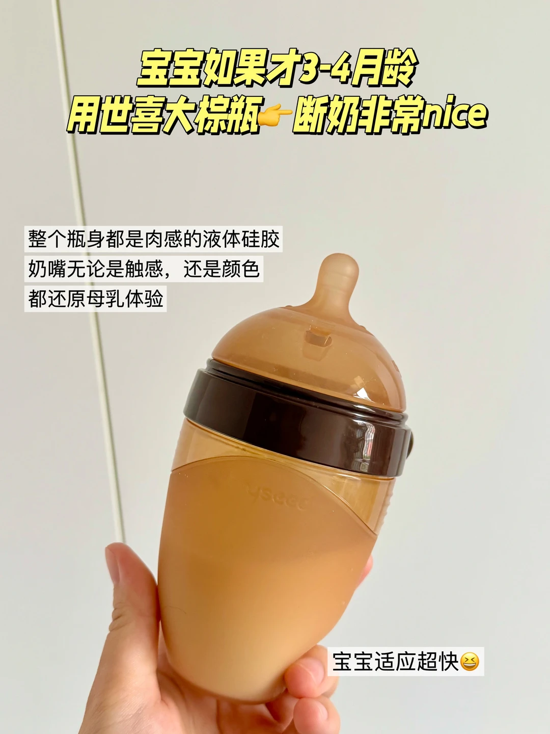 4、如果宝宝才3-4个🈷️大,可以买👉世喜大棕瓶,奶嘴是肉感液态硅胶,而且肤色、大小都很像妈妈的,宝宝更易接受。再者,它的瓶身是可以挤压的软硅胶,可以挤压的,宝宝如果刚开始有点抗拒,你就挤一点奶进去宝宝嘴里,让他知道这是奶!