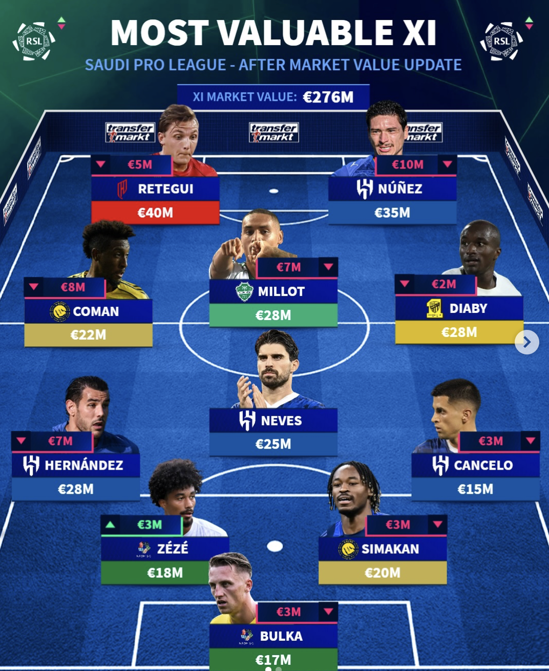 中场:科曼(利雅得胜利/2200万);米约(吉达国民/2800万);内维斯(利雅得新月/2500万);迪亚比(吉达联合/2800万)